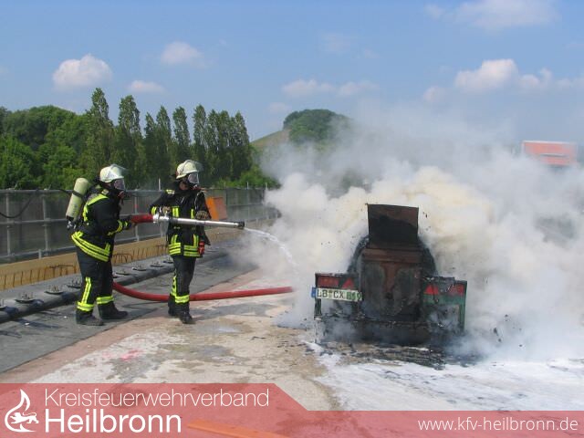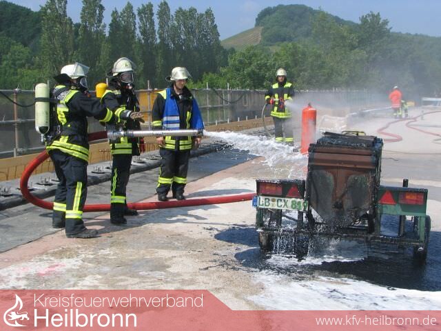 Aufgrund der zunächst unklaren Lage wurde von der Leitstelle neben der Feuerwehr Weinsberg auch die Wehren aus Neckarsulm und Erlenbach alarmiert. Nachdem die Kräfte aus Weinsberg eingetroffen waren, musste zahlreiches Schlauchmaterial über Büsche und Sträucher verlegt werden, bevor der brennende Teeranhänger durch einen Trupp unter PA mit Schwerschaum und die in der Nähe stehende Gasflasche mit einem C-Rohr gekühlt werden konnte. Nach ca. 45 Minuten war der Einsatz beendet.