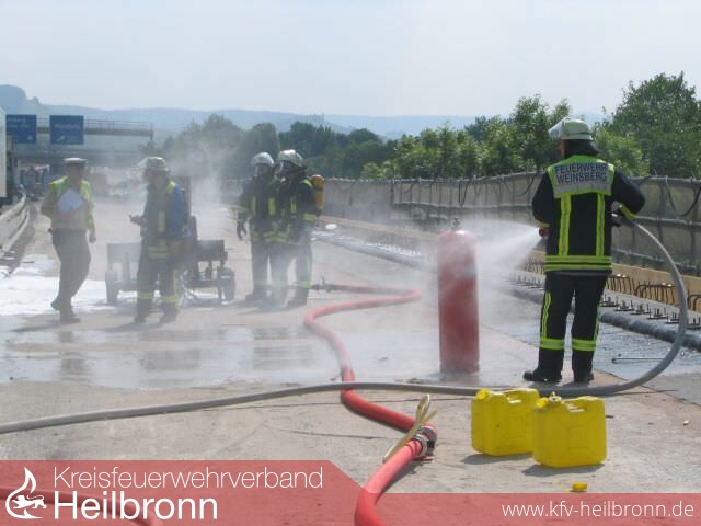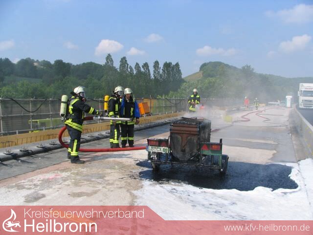 Während den Ausbauarbeiten im Baustellenbereich der A 6 kam es vermutlich durch Überhitzung zu einem Brand eines Teeranhängers. Der dort tätige Bautrupp brachte erst die in der Nähe befindliche Gasflasche in Sicherheit, bevor die Feuerwehr alarmiert wurde.