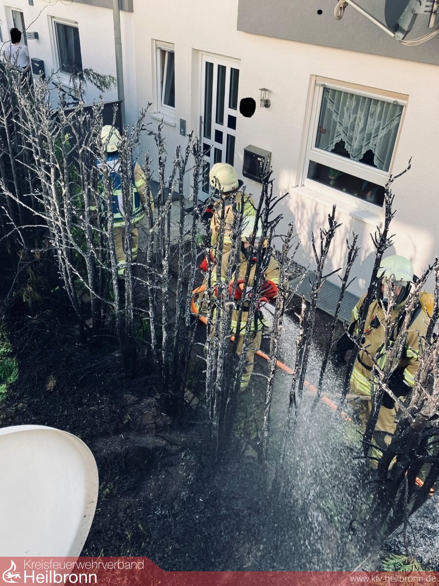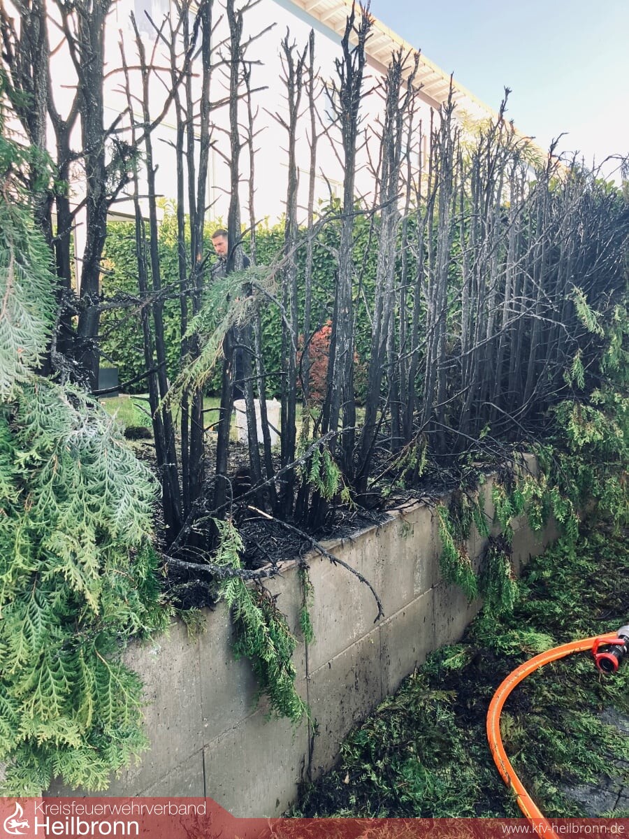 Am heutigen Donnerstag fiel kurz nach 17 Uhr erneut eine Thujahecke einem Feuer zum Opfer. Die Hecke an dem Reiheneckhaus wurde vermutlich versehentlich bei Bitumenarbeiten am Dach einer angrenzenden Garage entzündet. Die Flammen breiteten sich schlagartig aus. Durch die enorme Hitze war bereits ein Fenster am Nachbargebäude geborsten. Beim Eintreffen in der Agnese-Schebest-Straße waren die Bewohner bereits dabei die Flammen mit einem Gartenschlauch zu löschen. Die Einsatzkräfte führten Nachlöscharbeiten durch und kontrollierten den vom Feuer betroffenen Bereich mit einer Wärmebildkamera.