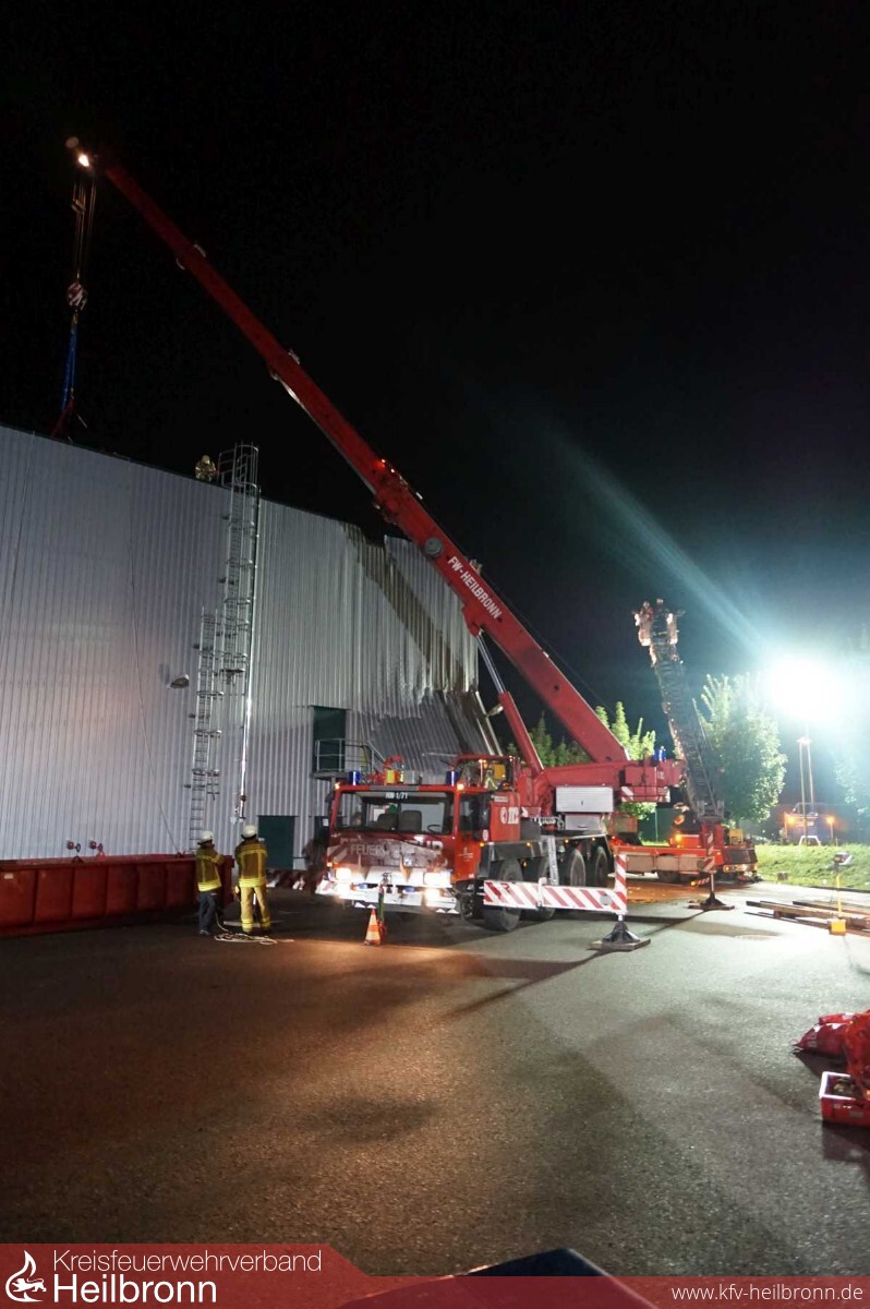 Am anderen Schadensort gestaltete sich das Aufgabengebiet etwas größer. Hier hatte das THW Weinsberg neben der Beleuchtung des Schadenplatzes die Aufgabe, das Dach möglichst witterungsbeständig zu verschließen. Unter Leitung des Fachberaters vom THW Widdern wurden aus Holz drei freitragende Module von 8m Spannweite gebaut und mit Baufolien versehen. Mit Hilfe des Krans der Feuerwehr Heilbronn wurden diese dann über dem offenen Dach auf das bestehende Tragwerk aufgelegt und gesichert. Mit Hilfe einer Drehleiter der Feuerwehr Bad Friedrichshall wurden Fassaden- und Dachteile, die eine Gefahr darstellten, entfernt oder gesichert.