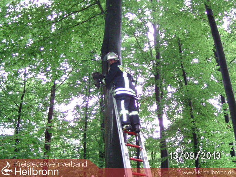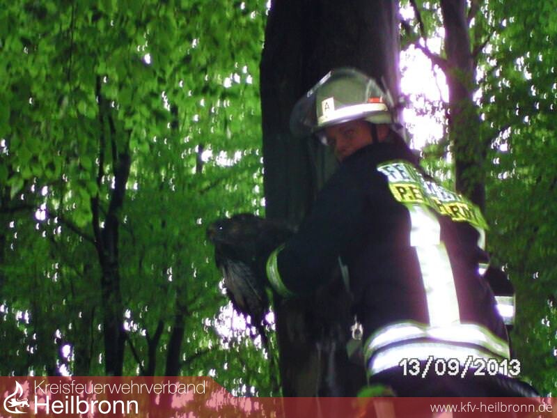 Eine Spaziergängerin entdeckte am Freitagmittag auf dem Vogelherdweg den Bussard, der sich in ca. 5 Metern Höhe kopfüber mit dem Fuß in einem Spalt im Baum verfangen hatte.