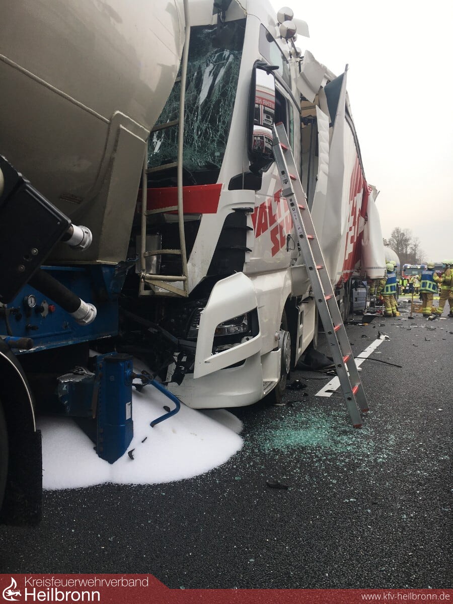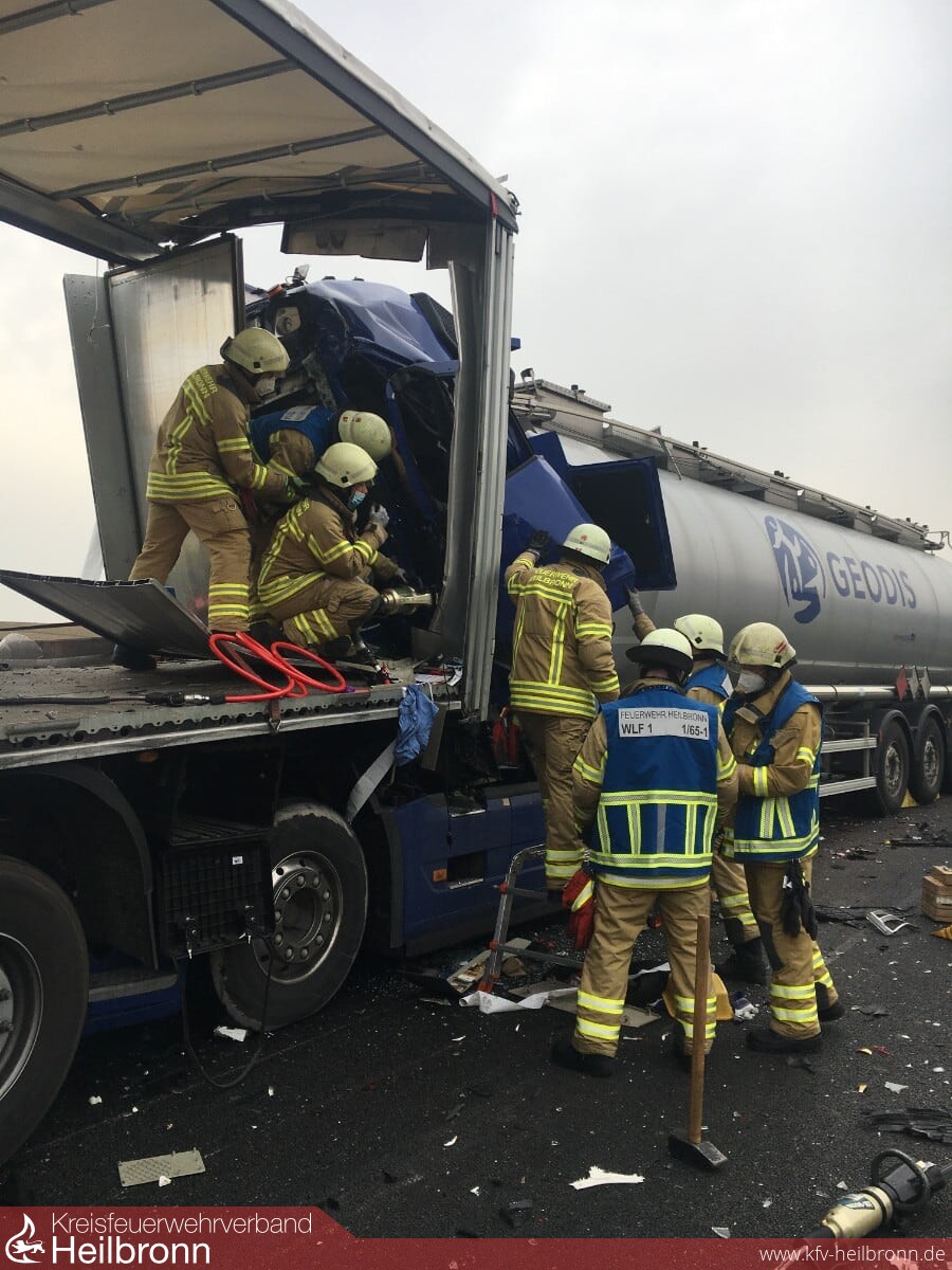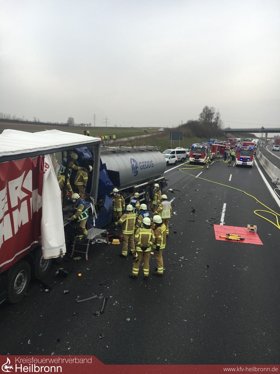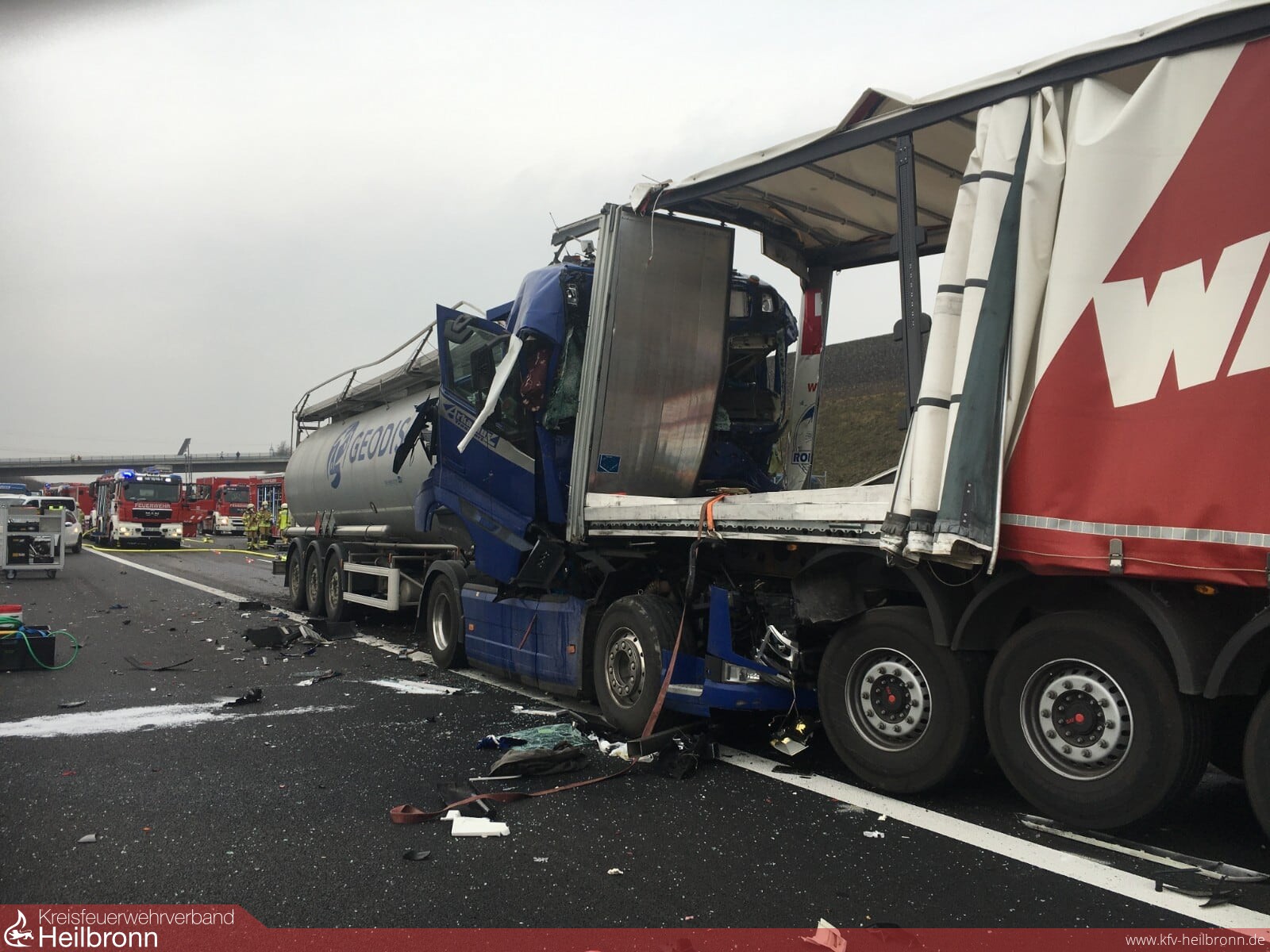 Gegen12.42 Uhr wurde die Feuerwehr zu einem Lkw-Unfall mit drei beteiligten Fahrzeugen auf die Autobahn 6 kurz nach der Anschlussstelle Bad Rappenau alarmiert. Der Fahrer eines mit Gefahrgut beladenen Sattzuges hatte vermutlich das Stauende zu spät erkannt und schob seinen Vordermann auf einen weiteren Lkw auf. Hierbei wurde der Unfallverursacher so schwer verletzt, dass er noch an der Unfallstelle verstarb. Der Fahrer des mittleren Lkw wurde schwer verletzt, konnte sich aber selbst aus seinem Fahrzeug retten. Zur Bergung der eingeklemmten Person mussten die Einsatzkräfte verschiedene hydraulische Rettungsgeräte sowie Rettungssägen einsetzen. Bei dem Unfallverursacher handelte es sich um ein mit 23 Tonnen Gefahrgut beladenes Silofahrzeug. Trotz starker Deformation konnte kein Austritt des Medium festgestellt werden. Bevor mit der Fahrzeugbergung begonnen werden konnte, musste das Umpumpen des leichtentzündlichen Acetons in Absprache mit dem Fachberater „Gefahrgut“ sowie einem Abschleppunternehmen organisiert werden. Die Umfüll- und Aufräumarbeiten zogen sich noch mehrere Stunden hin.