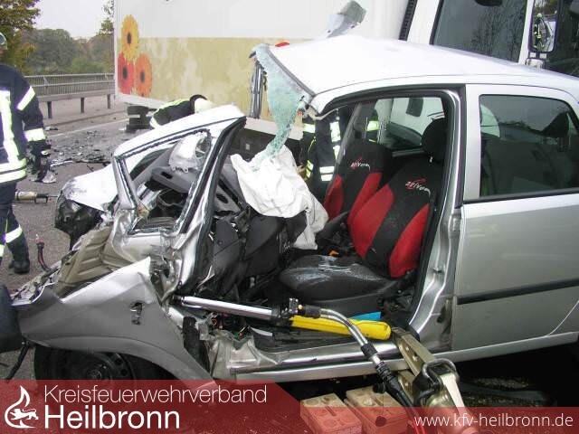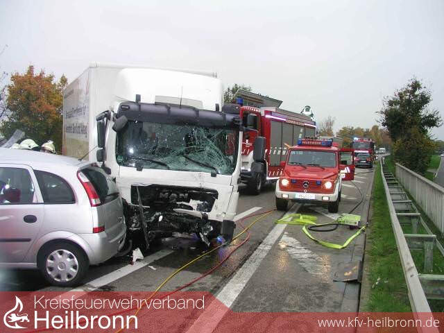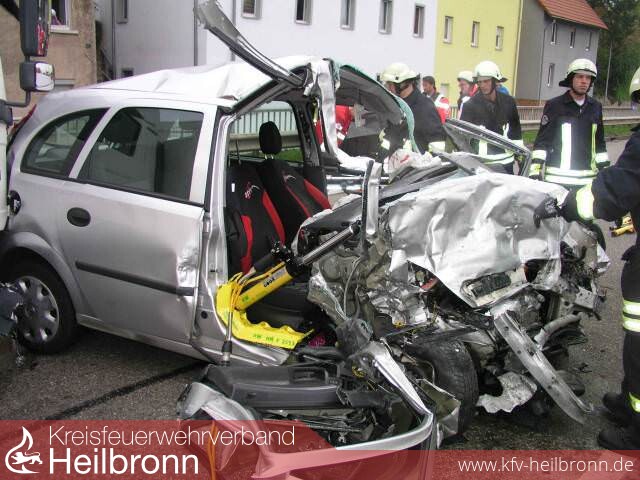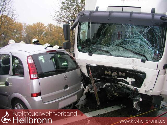 Aus unbekannter Ursache geriet ein Opel Meriva auf der Neckartalstraße in den Gegenverkehr und kollidierte kurz vor der Neckargartacher Brücke frontal mit einem 7,5-Tonner-Lkw. Der Pkw war von Heilbronn kommend in Richtung Neckargartach unterwegs.