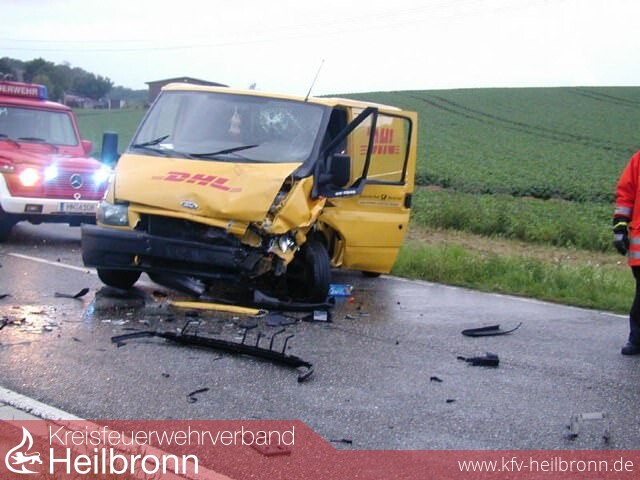 28-jähriger Lenker eines Ford Transit fährt von Kirchhausen kommend in Richtung Frankenbach. Im Verlauf einer lang gezogenen Rechtskurve, ca. 400 m nach der Abzweigung Biberach überholt er vorausfahrenden Lkw. Beim Wiedereinscheren prallt der Transit auf ordnungsgemäß entgegenkommenden Pkw VW Passat.