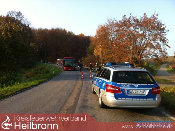 Zu einem tödlichen Verkehrsunfall wurden Polizei, Rettungsdienst und die Feuerwehr am Samstagmorgen gerufen. Kurz vor 8 Uhr kam ein Linienbus aus bislang unbekannter Ursache zwischen Ilsfeld und Flein im Zuge einer leichten Rechtskurve auf die Gegenfahrbahn und prallte dort frontal mit einem entgegenkommenden VW Golf zusammen. Der 28-jährige Golffahrer wurde im Wrack seines Fahrzeugs eingeklemmt und starb noch an der Unfallstelle. Der 45 Jahre alte Busfahrer wurde leicht verletzt und erlitt außerdem einen Schock, weshalb er ins Krankenhaus gebracht werden musste. Die sieben erwachsenen Mitfahrer im Bus erlitten zum Teil einen leichten Schock. Alle konnten aber von der Unfallstelle abgeholt oder von der Feuerwehr nach Hause gefahren werden. Besonders tragisch an diesem Unfall war die Tatsache, dass der 28-Jährige Angehöriger der Freiwilligen Feuerwehr Flein war und so seine eigenen Kameraden zu seiner Bergung anrückten. Noch tragischer war, dass sich der Vater des jungen Mannes unter den ersten Einsatzkräften der Wehr befand. Er erlitt einen schweren Schock und musste ärztlich betreut werden. Zur Klärung der Unfallursache wurde ein Sachverständiger beauftragt. Die Feuerwehren Flein und Heilbronn waren mit insgesamt fünf Fahrzeugen und 20 Einsatzkräften am Unfallort. Der Rettungsdienst rückte mit drei Rettungswagen, einem Krankenwagen und einem Notarztwagen an. Die Strecke musste wegen der Bergungsarbeiten bis zum Mittag voll gesperrt werden.