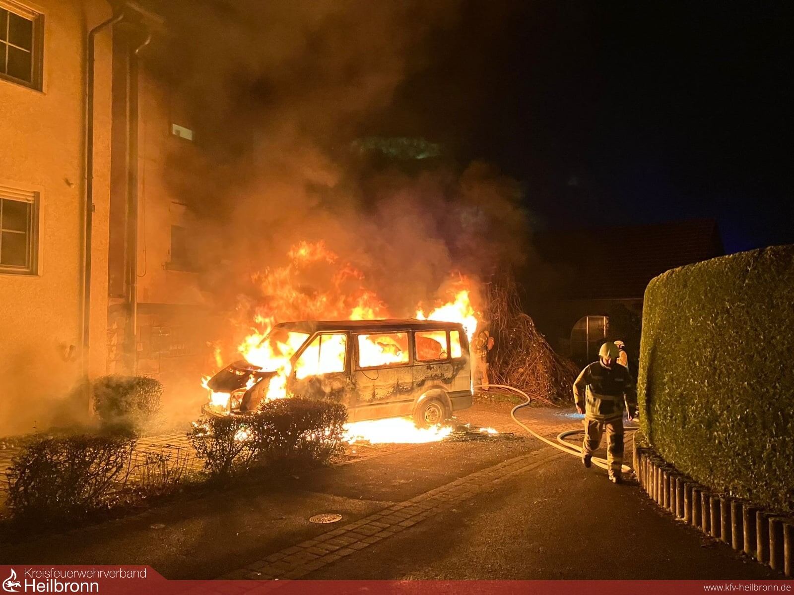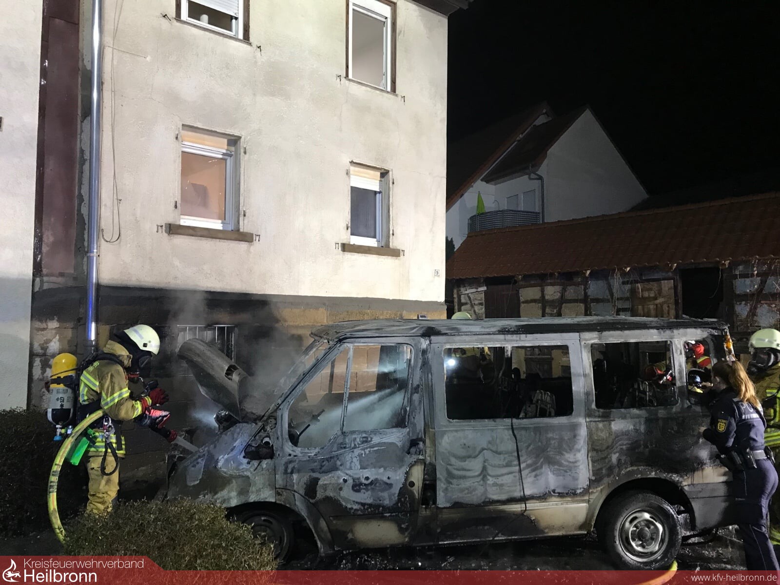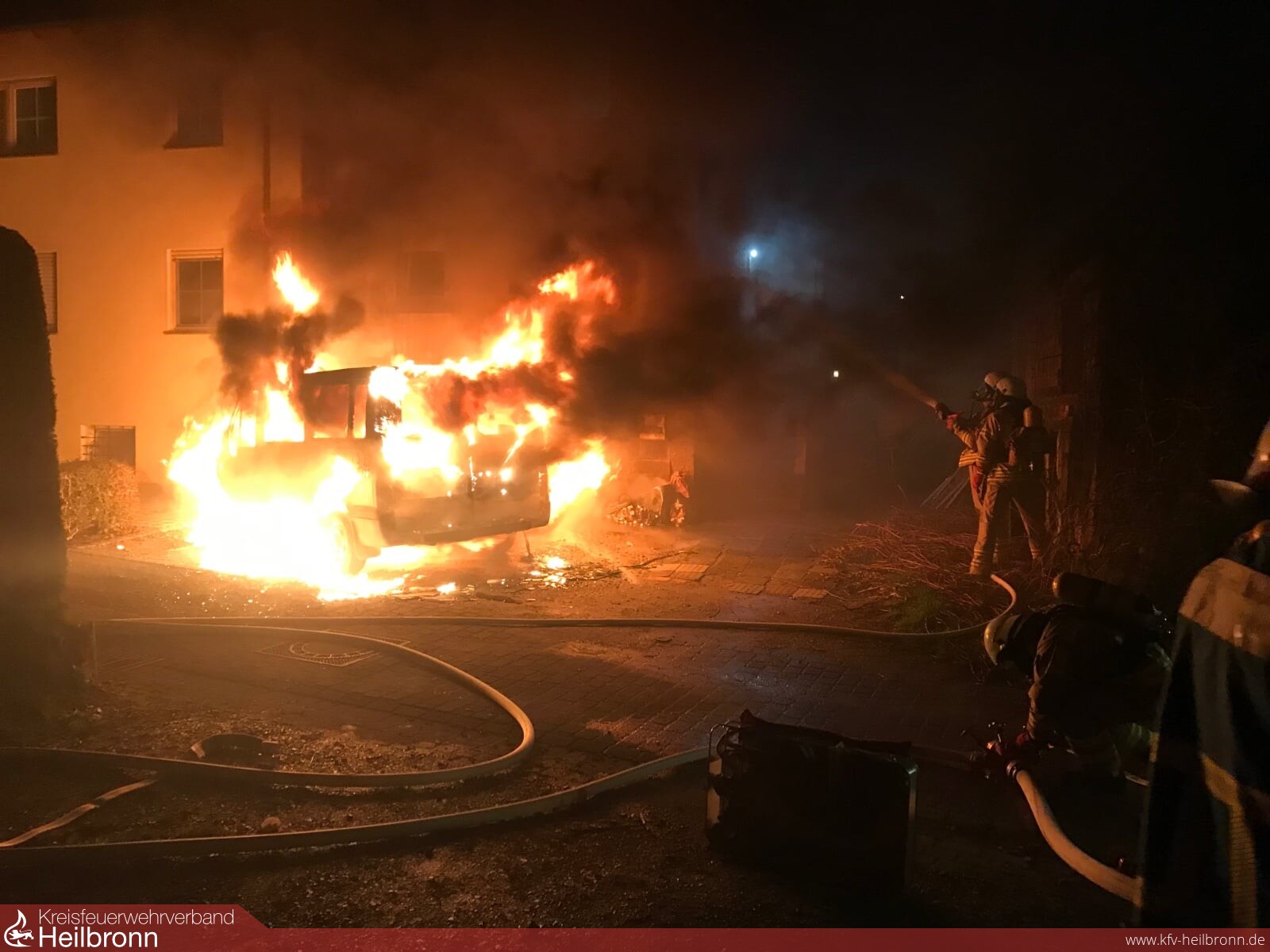Heute Nacht kurz vor 24 Uhr musste die Feuerwehr nach Heilbronn-Frankenbach ausrücken. In der Weidenmannsgasse war ein Transporter direkt neben einem Wohngebäude in Brand geraten. Beim Eintreffen der Einsatzkräfte stand der Bus bereits in Vollbrand. Dichter Rauch konnte über ein gekipptes Fenster ins Gebäude eindringen. Zwei Fenster waren aufgrund der großen Hitze bereits gesprungen. Umgehend wurden zwei Trupps mit zwei C-Rohren zur Brandbekämpfung eingesetzt. Weitere Trupps kontrollierten den Innenbereichen des Gebäudes. Zum Zeitpunkt des Brandes befanden sich 15 Personen in den Wohnungen. Alle Bewohner wurden durch die Feuerwehr evakuiert und vom Rettungsdienst gesichtet. Ein in unmittelbarer Nähe geparkter Pkw wurde ebenfalls in Mitleidenschaft gezogen. Der Besitzer konnte diesen jedoch noch vor dem Eintreffen der Feuerwehr wegstellen. Die Feuerwehr Heilbronn war mit einem Löschzug, bestehend aus der Berufsfeuerwehr sowie der Freiwilligen Feuerwehr, Abteilung Frankenbach, im Einsatz.