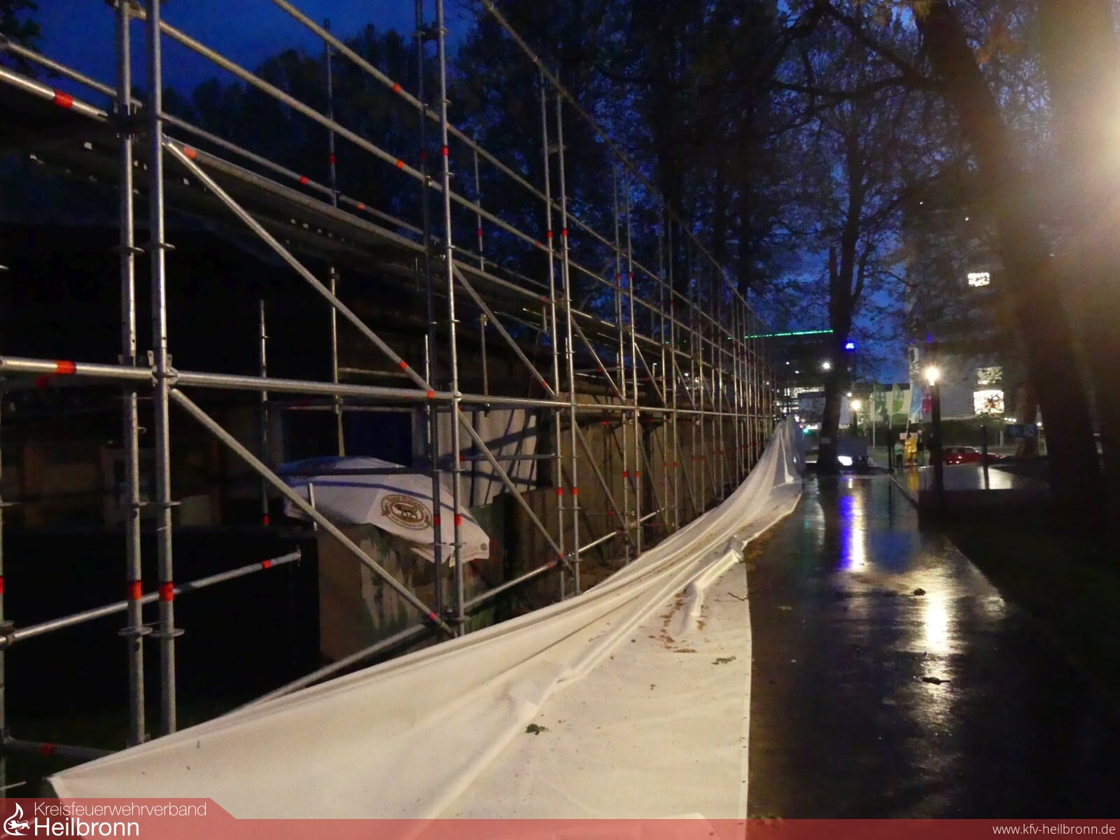 Durch das plötzlich auftretende Unwetter kam es ab 19.15 Uhr zu mehreren Sturmschäden im Stadtgebiet. Hierbei mussten die Einsatzkräfte losgerissene Banner und umgestürzte Bauzäune sichern sowie eine defekte Tür demontieren.