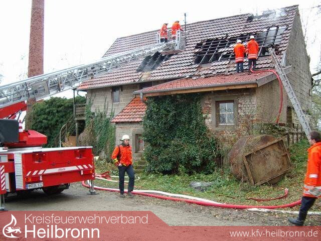 Lediglich im Dachstockbereich gab es noch einzelne Glutnester, an welche die Kameraden aus Jagsthausen, nicht gezielt rankamen. Mit der DLK und einem Einreißhaken wurde die zum Teil schon durchgebrannte Dachhaut um die Brandstellen herum abgedeckt und dann die Holzbalken vollends gezielt abgelöscht.