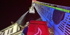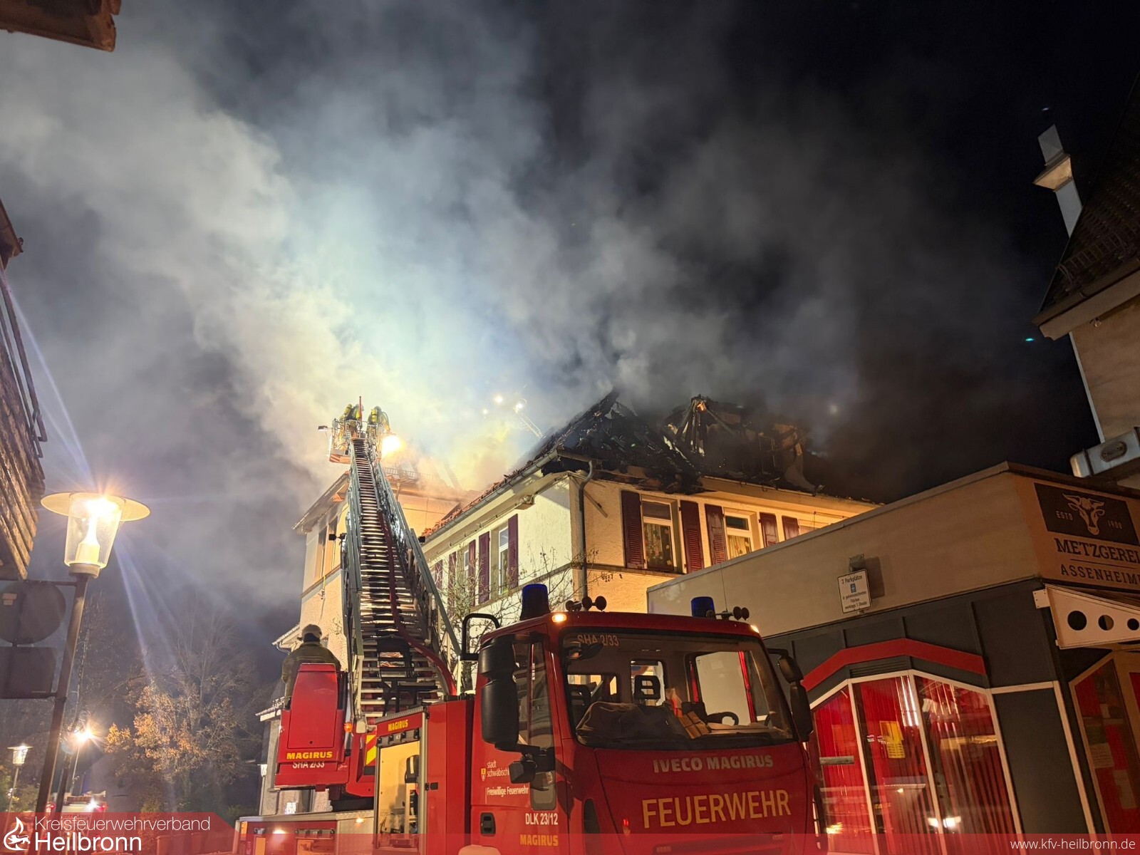 Beide Drehleitern, die gleichzeitig an der Einsatzstelle eingetroffen sind, waren bis kurz nach 1:00 Uhr im Einsatz und löschten Glutnester sowie immer wieder aufflammende Bereiche ab.