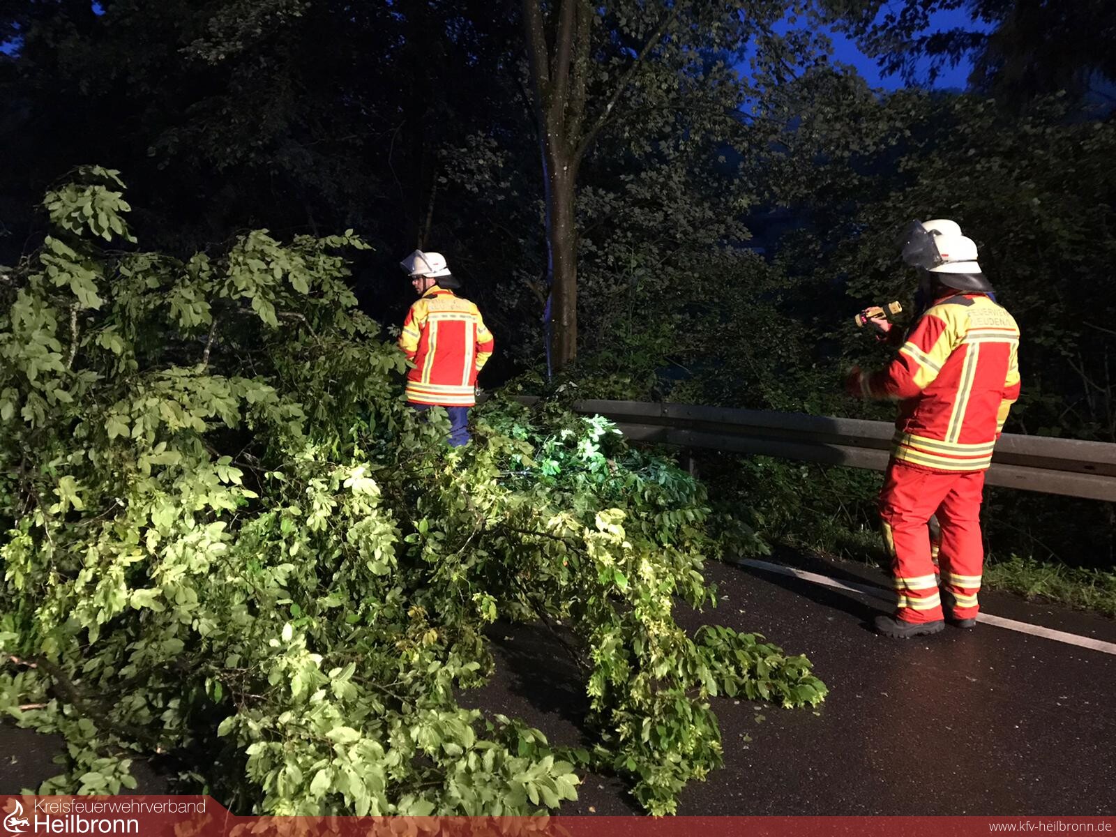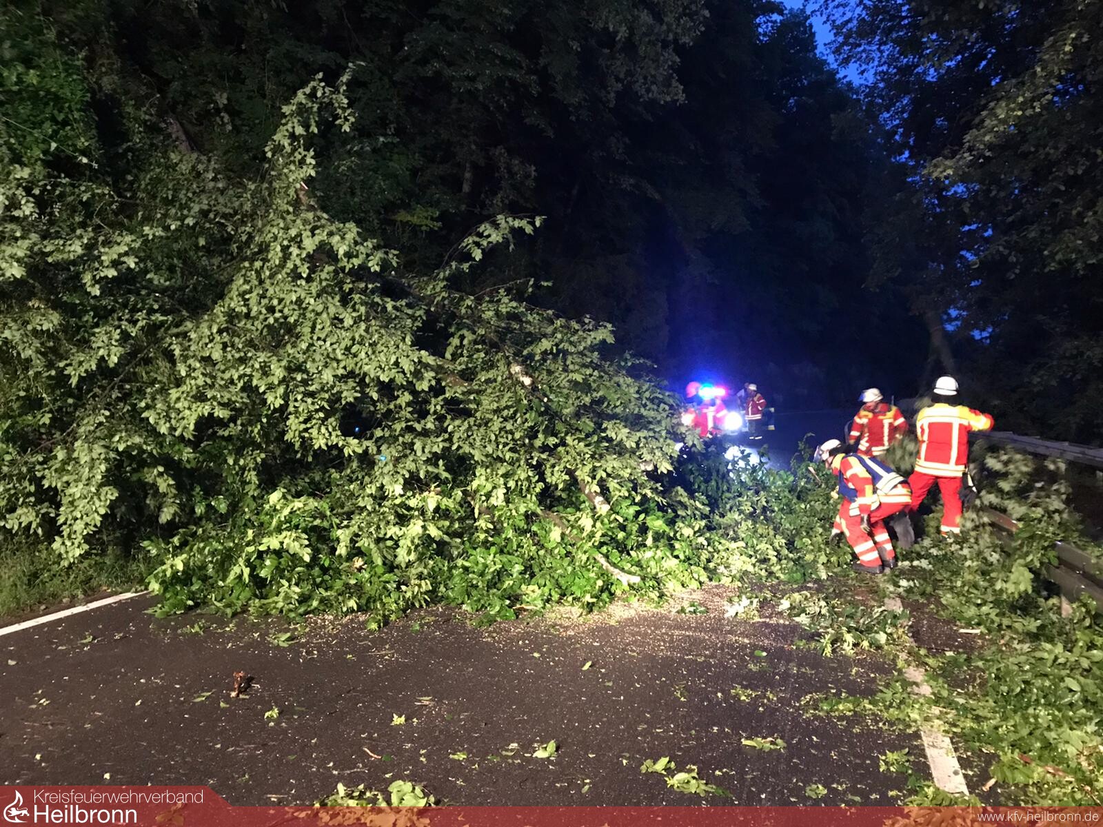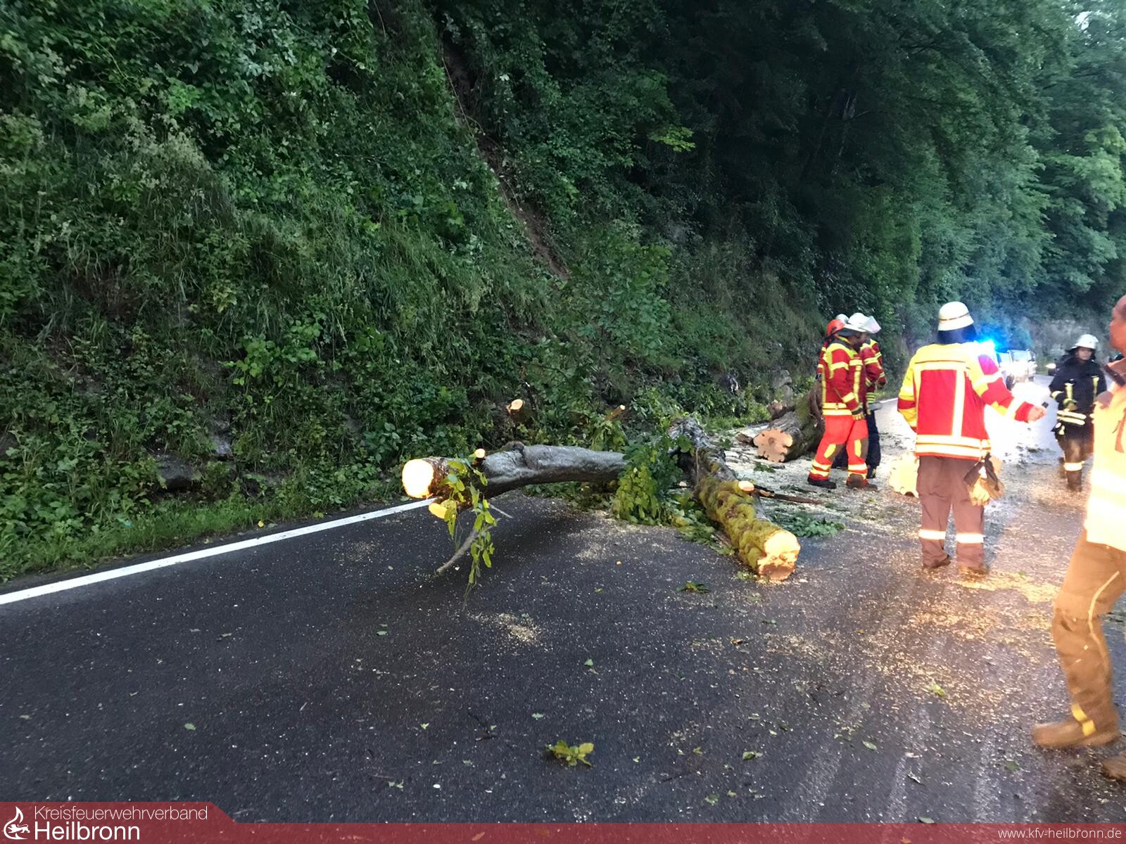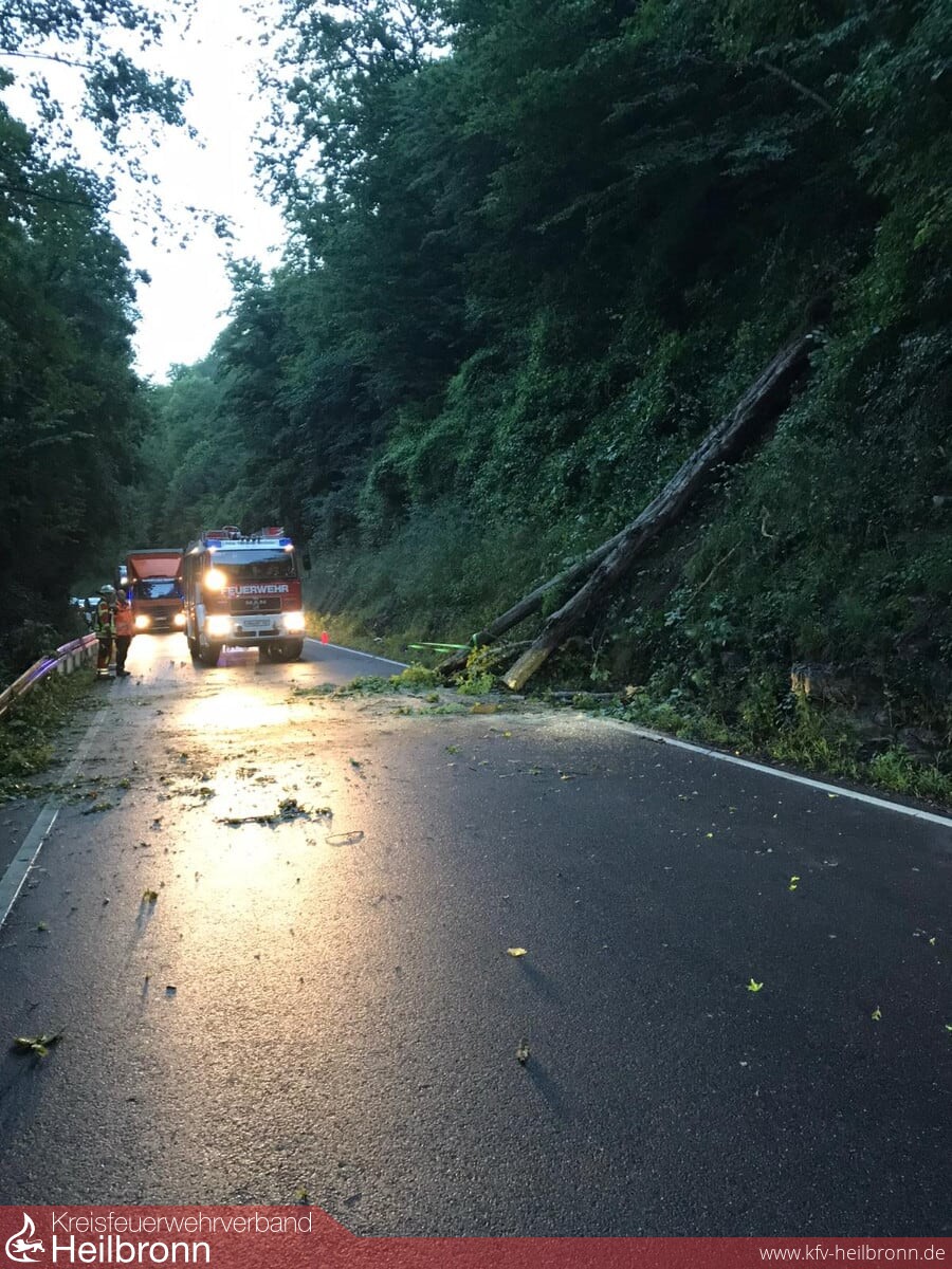 Ein großer Baum lag quer über die Fahrbahn des Bachsträßles, das zur Zeit eine wichtige Umleitungsstrecke aufgrund der gesperrten Ortsdurchfahrt Neudenau ist.