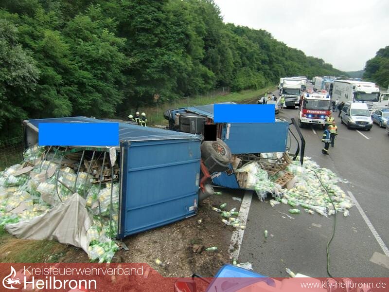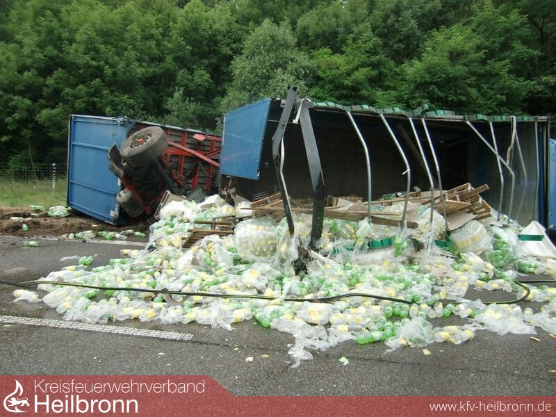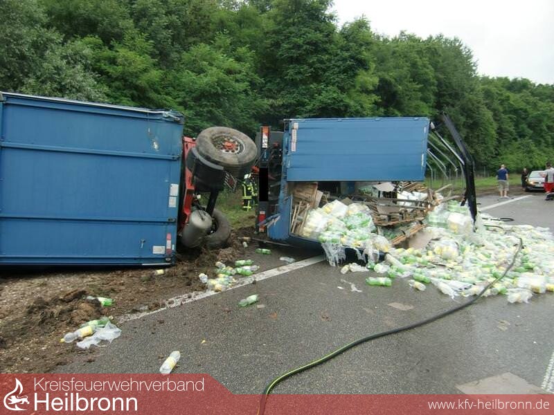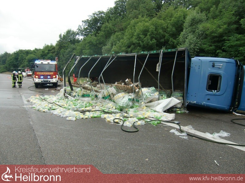 Zwischen den Anschlußstellen Weinberg und Untergruppenbach war es in Fahrtrichtung Stuttgart zu einem Unfall zwischen zwei LKW gekommen, in dessen Folge ein mit Getränkeflaschen beladener Hängerzug umkippte. Die Ladung veteilte sich über die Fahrspuren der BAB. Aufgrund des Rückstaus und der aktuellen Baustelle in diesem Bereich konnten die Wehren aus Weinsberg und Heilbronn zunächst nicht an die Einsatzstelle gelangen, daher wurde zusätzlich die Feuerwehr Untergruppenbach alarmiert, die nach Vollsperrung der BAB entgegen der Fahrtrichtung zur Einsatzstelle anfahren konnte.