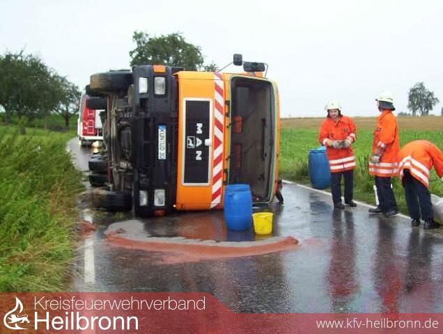 Der LKW war in einer Kurve zuerst in einen Acker gefahren und wohl beim Versuch, wieder auf die Straße zu lenken, umgestürzt.