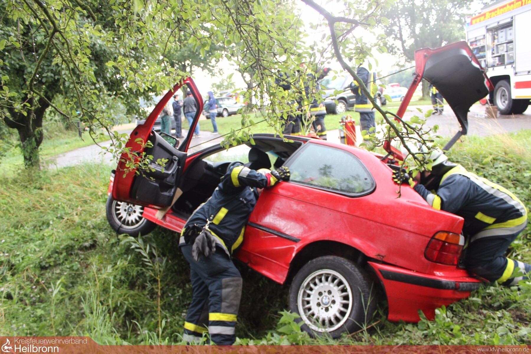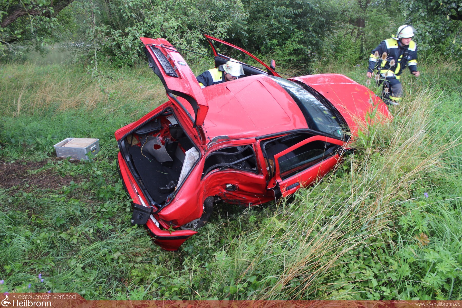 Am seitlich deformierten Unfallfahrzeug liefen Betriebsstoffe aus. Diese wurden von den Feuerwehrkräften der Abteilungen Neipperg und Brackenheim aufgefangen. Da auf dem benachbarten Mönchsbergsee leichte Ölschlieren zu erkennen waren wurde der GW-T mit Ölwehranhänger nachgefordert. Bei der weiteren Erkundung der Einsatzstelle wurde zusätzlich noch ein undichter Fahrzeuggastank erkannt. Daraufhin wurde der Arbeitsbereich auf ein Minimum an Einsatzkräften beschränkt und der Brandschutz durch einen ausgerüsteten Atemschutztrupp übernommen. Mit einem Ex-Messgerät wurde die Einsatzstelle ständig überwacht.