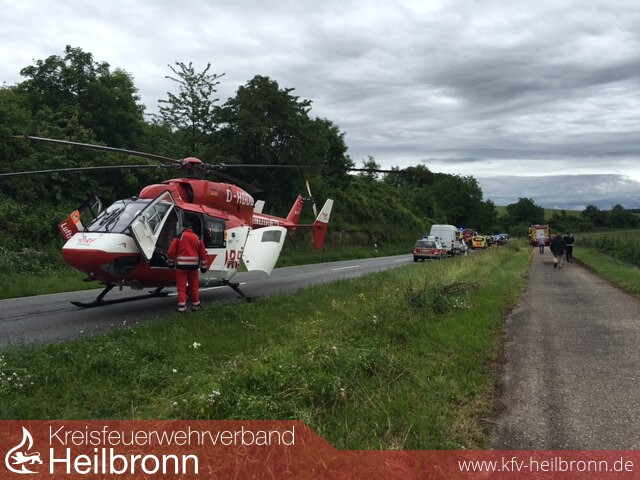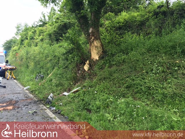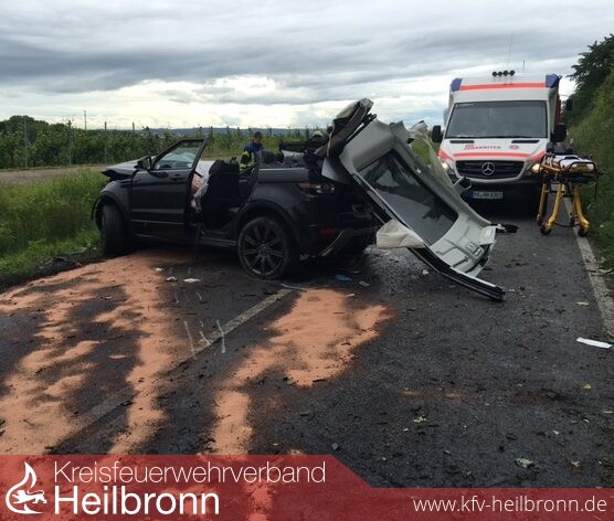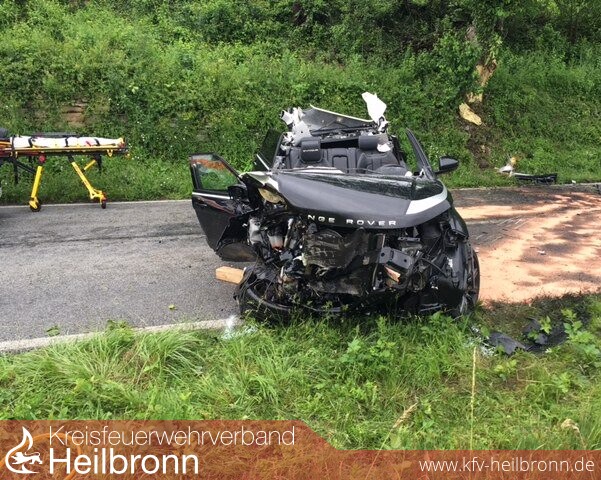 befreit werden. Bisherigen Erkenntnissen zufolge befuhr die Frau gegen 15 Uhr mit ihrem Range Rover Evoque die Kreisstraße 2155 von der Waldkreuzung in Richtung Talheim und überholte einen vorausfahrenden PKW. Beim Wiedereinscheren geriet sie mit ihrem Geländewagen auf das unbefestigte Bankett, worauf dieser ins Schlingern geriet. Die Fahrerin verlor schließlich die Kontrolle über das Fahrzeug, das nach rechts von der Fahrbahn abkam und dort gegen eine Böschung sowie einen Baum prallte. Die Fahrerin wurde eingeklemmt und von der Feuerwehr, die mit insgesamt 20 Mann im Einsatz war, aus dem Fahrzeug befreit. Da zunächst unklar war, ob weitere Personen beim Unfall verletzt wurden, fuhren zwei Rettungswagen dorthin. Ferner befanden sich ein Notarzt sowie ein Rettungshubschrauber im Einsatz, mit dem die Schwerverletzte ins