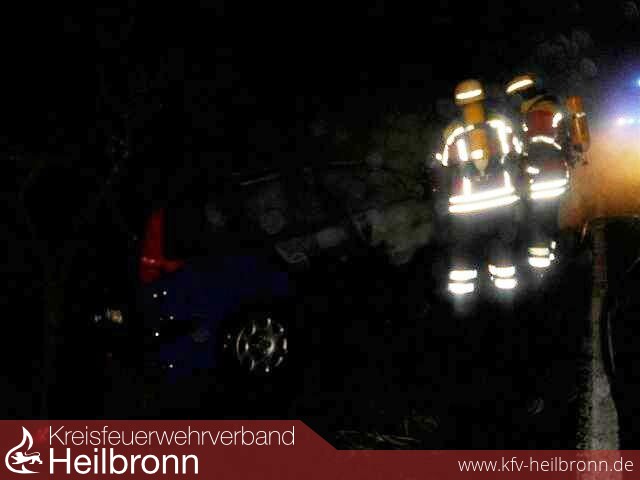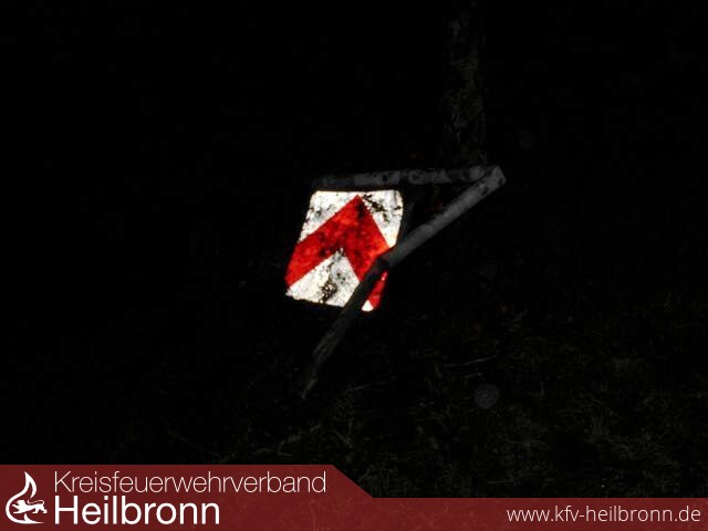 Auf der L 1096 von Herbolzheim in Richtung Untergriesheim kam ein Verkehrsteilnehmer mit seinem PKW ausgangs einer scharfen, unübersichtlichen Rechtskurve vermutlich wegen nicht angepasster Geschwindigkeit auf teilweiser reifglatter Fahrbahn nach links von der Fahrbahn ab, riss eine Kurvenleittafel aus und prallte frontal gegen einen Baum.