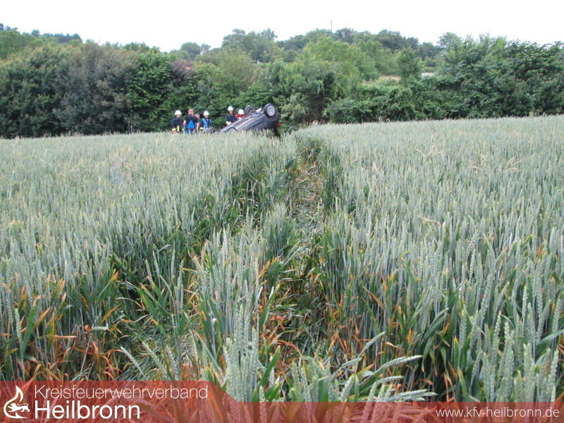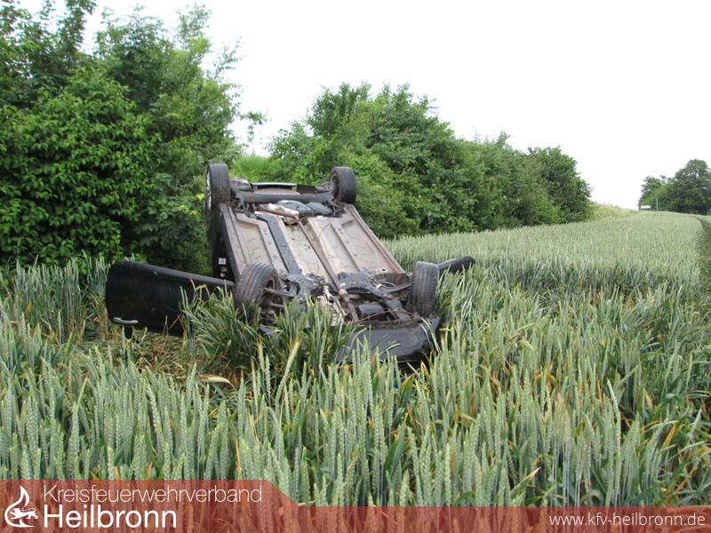 Zu einem Verkehrsunfall Pkw, mit einer eingeklemmten Person, wurden die Einsatzabteilungen Neudenau und Herbolzheim alarmiert. Schon bei der Alarmierung war bekannt, dass der Pkw auf dem Dach liegt.