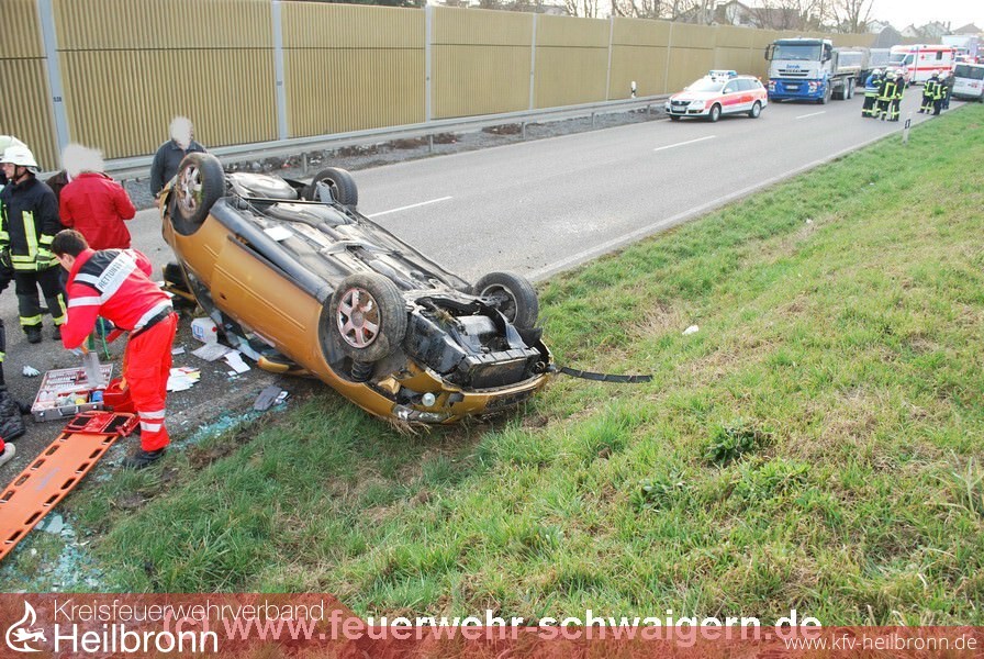 Nach ersten Erkenntnissen der Polizei überholte ein in Richtung Eppingen fahrender Audi eine Kolonne. Als er in Höhe eines Kleintransporters überholte, schwertde dessen Fahrer, vermutlich um selbst zu Überholen aus. Dabei kam es zur Kollission, bei der der Audi von der Straße abkam und sich überschlug. Bis zum Eintreffen der Rettungskräfte waren alle Insassen bereits durch Ersthelfer aus dem Fahrzeug befreit und betreut.