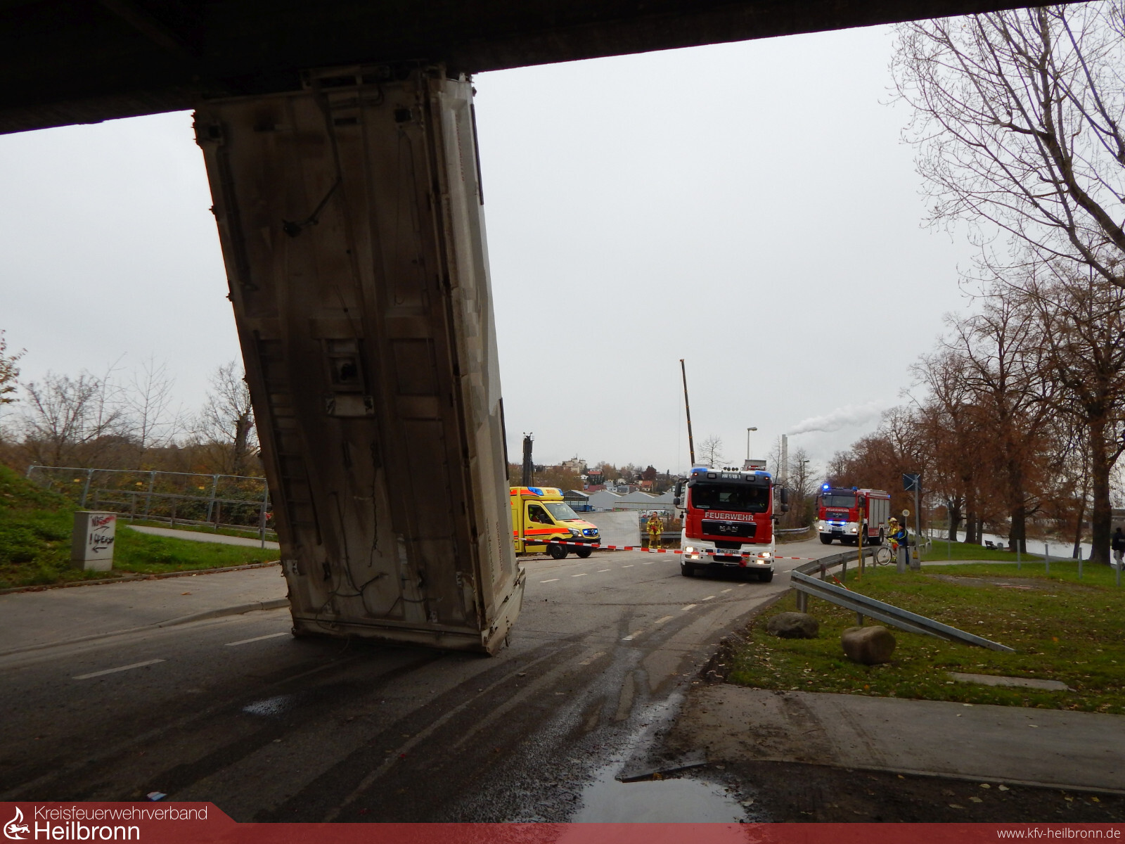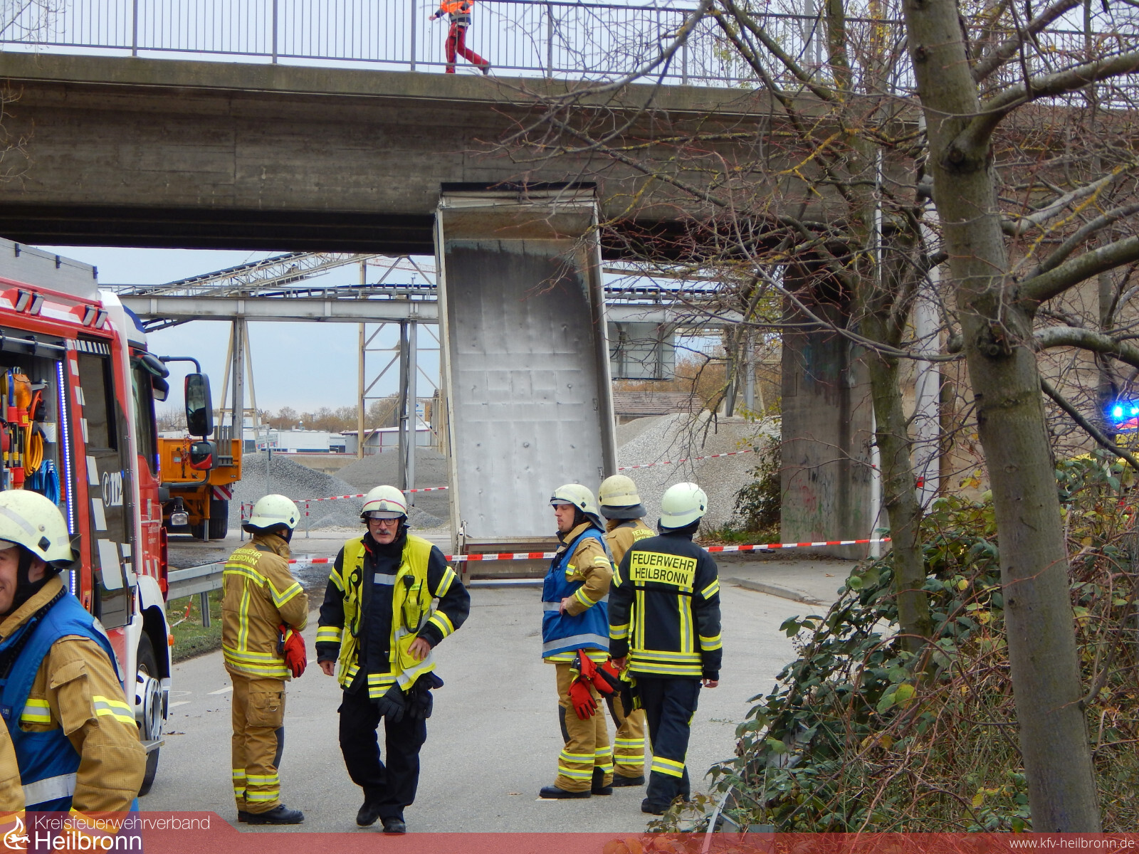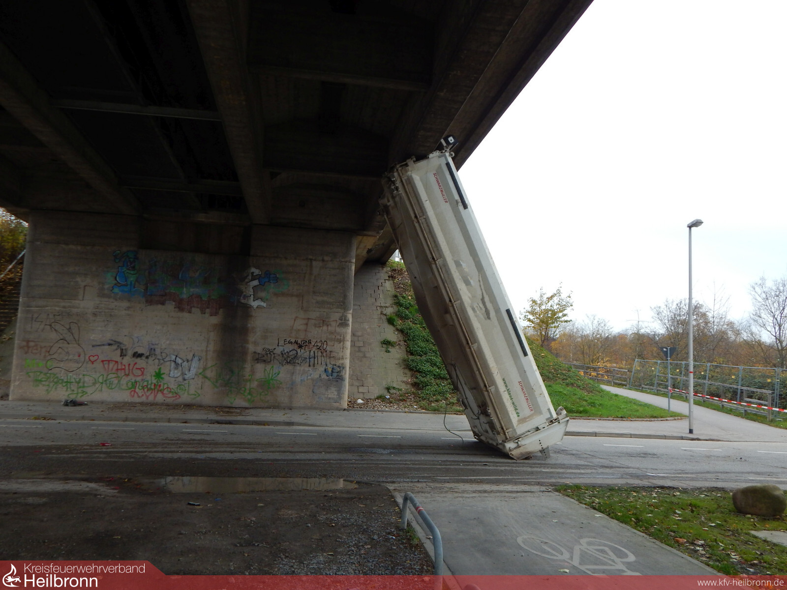 Beim Eintreffen vor Ort stellte sich heraus, dass ein Baustellenfahrzeug mit aufgestellter Kippermulde unter der Peter-Bruckmann-Brücke durchgefahren war. Hierbei verkeilte sich diese zwischen Brücke und Straße, was einen kompletten Abriss der Mulde vom Fahrgestell zur Folge hatte.