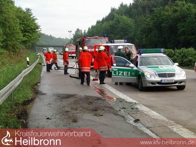Im Einsatz war ein Fahrzeug der Autobahnpolizei, zwei Rettungswagen und von der FF Möckmühl, das TLF16/25, der RW2 und der VRW.