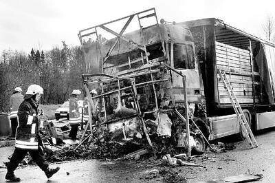 Der Fahrer des Sattelzuges erlitt leichte Verletzungen. Gerade noch rechtzeitig konnte die Feuerwehr eine Propangasflasche aus dem völlig abgebrannten Kleinlastwagen bergen; auch die Ladung Diesel des Lkw konnten die Floriansjünger größten Teils abpumpen.