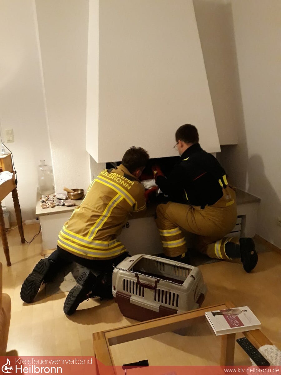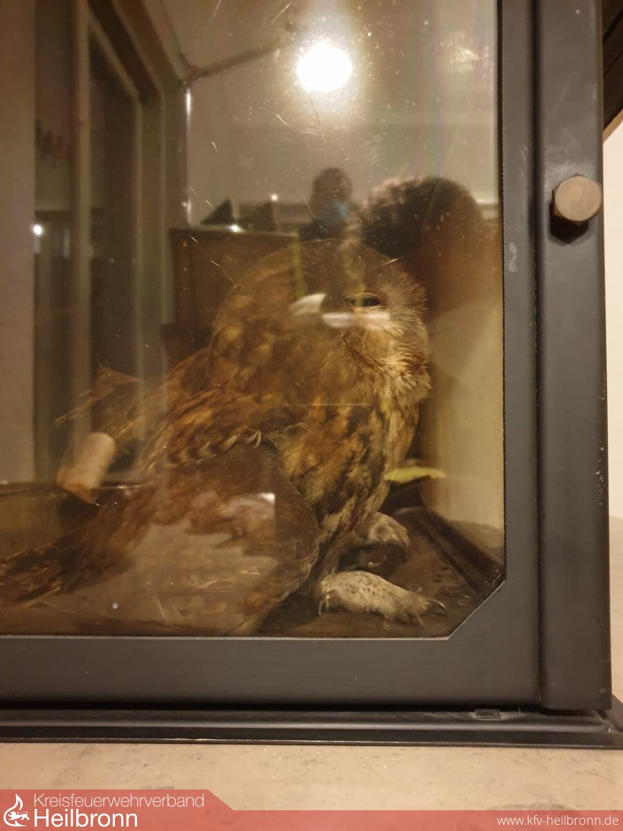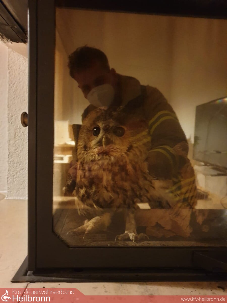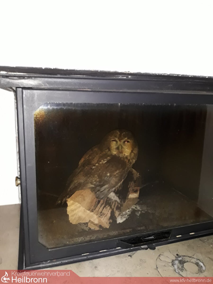 Zu einer Tierrettung der ungewöhnlichen Art musste die Feuerwehr gegen 22.00 Uhr ausrücken. Eine Anruferin aus der Hundsbergstraße hatte der Integrierten Leitstelle die Landung eines Vogels in ihrem Kaminofen gemeldet. Die Feuerwehr rückte mit zwei Mann an. Vor Ort wurde sie von der Bewohnerin sowie dem etwas hilflos hinter der Ofenscheibe hervorschauenden Waldkauz erwartet. Glücklicherweise hatten die Bewohner den Ofen an diesem Abend nicht in Betrieb genommen, was für den Greifvogel sicherlich schlecht ausgegangen wäre. Die Einsatzkräfte befreiten den kleinen Kauz vorsichtig aus seiner weniger gut geeigneten Behausung und brachten ihn zur Greifvogelpflegestation nach Bad Friedrichshall.