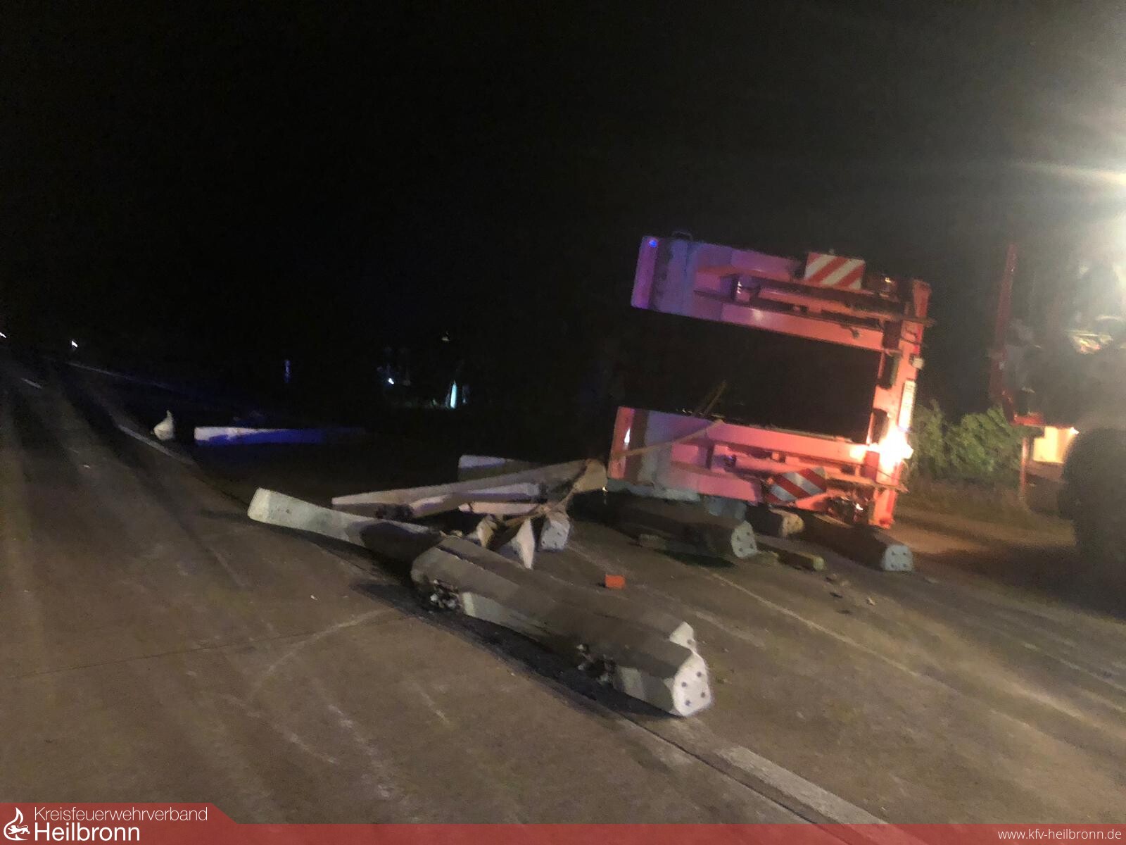 Osterburken: Unfall mit mehreren LKW auf der A 81 Nach bisherigem Ermittlungsstand befuhr ein 70-jähriger LKW-Fahrer am Mittwoch gegen 20.30 Uhr die A 81 in Fahrtrichtung Würzburg. Zwischen den Anschlussstellen Möckmühl und Osterburken, bei Km 502, setzte er zum Über-holen eines vor ihm fahrenden LKW an. Dessen Fahrer war ein 46-Jähriger aus Fürth. Beim Ausscheren übersah er einen links neben ihm in gleicher Richtung fahren Klein LKW, Ford Transit, der von einem 59-Jährigen gelenkt wurde. Es kam zur Kollision mit diesem Klein LKW. Danach lenkte der 70-Jährige wieder nach rechts und streift den LKW, den er zuvor überholen wollte. Durch den Zusammenstoß gerät dieser LKW mit Anhänger ins Schleudern und wird nach rechts in den Grünstreifen abgewiesen. Im weiteren Verlauf durchbricht er die Schutzplanke, beschädigt eine Notrufsäule, wird wieder zurückgeschleudert und stößt gegen die Mittelleitplanke. Von dort wird er wieder nach rechts zurückgeschleudert und kommt im rechten Grünstreifen auf der Seite zum Liegen. Der Fahrer wurde schwer verletzt in seinem Führerhaus eingeklemmt. Die Freiwilligen Feuerwehr Widdern war mit 17 Mann vor Ort. Die Ladung des umgestürzten LKW bestand aus 40 Eisenbahnschwellen aus Beton mit einem Gewicht von jeweils 250 kg. Die Schwellen lagen über die gesamte Fahrbahn verstreut. Ein 36-jähriger BMW -Fahrer aus Bad Mergentheim konnte den Hindernissen nicht mehr rechtzeitig ausweichen und fuhr in die Schwellen. Das Technische Hilfswerk Widdern war mit 15 Mann und schwerem Räumgerät eingesetzt, um die Betonschwellen von der Fahrbahn zu entfernen. Der Gesamtsachschaden beläuft sich auf etwa 80.000,– EUR. Die Autobahn war in Fahrtrichtung Würzburg bis gegen 04.30 Uhr voll gesperrt.