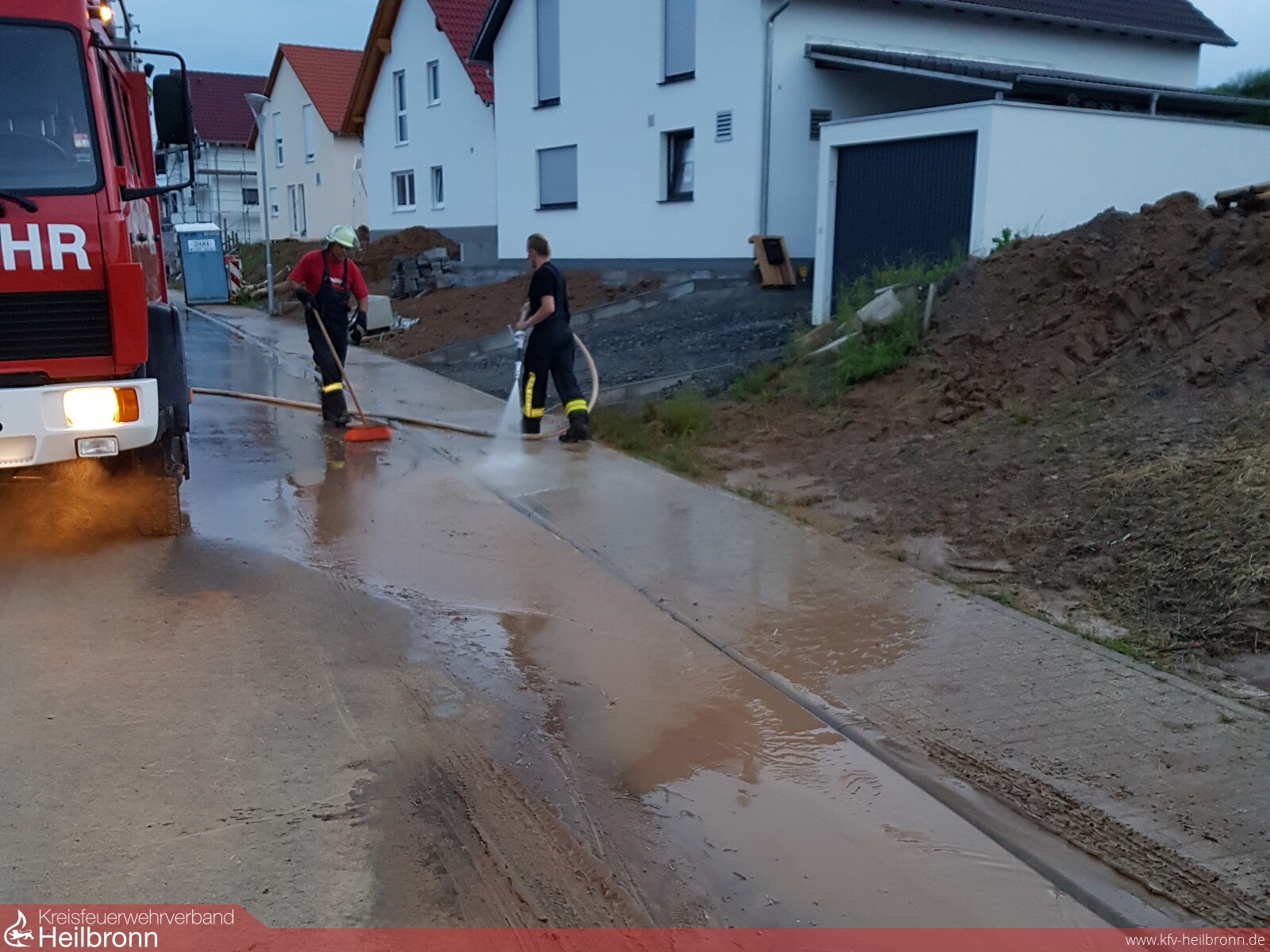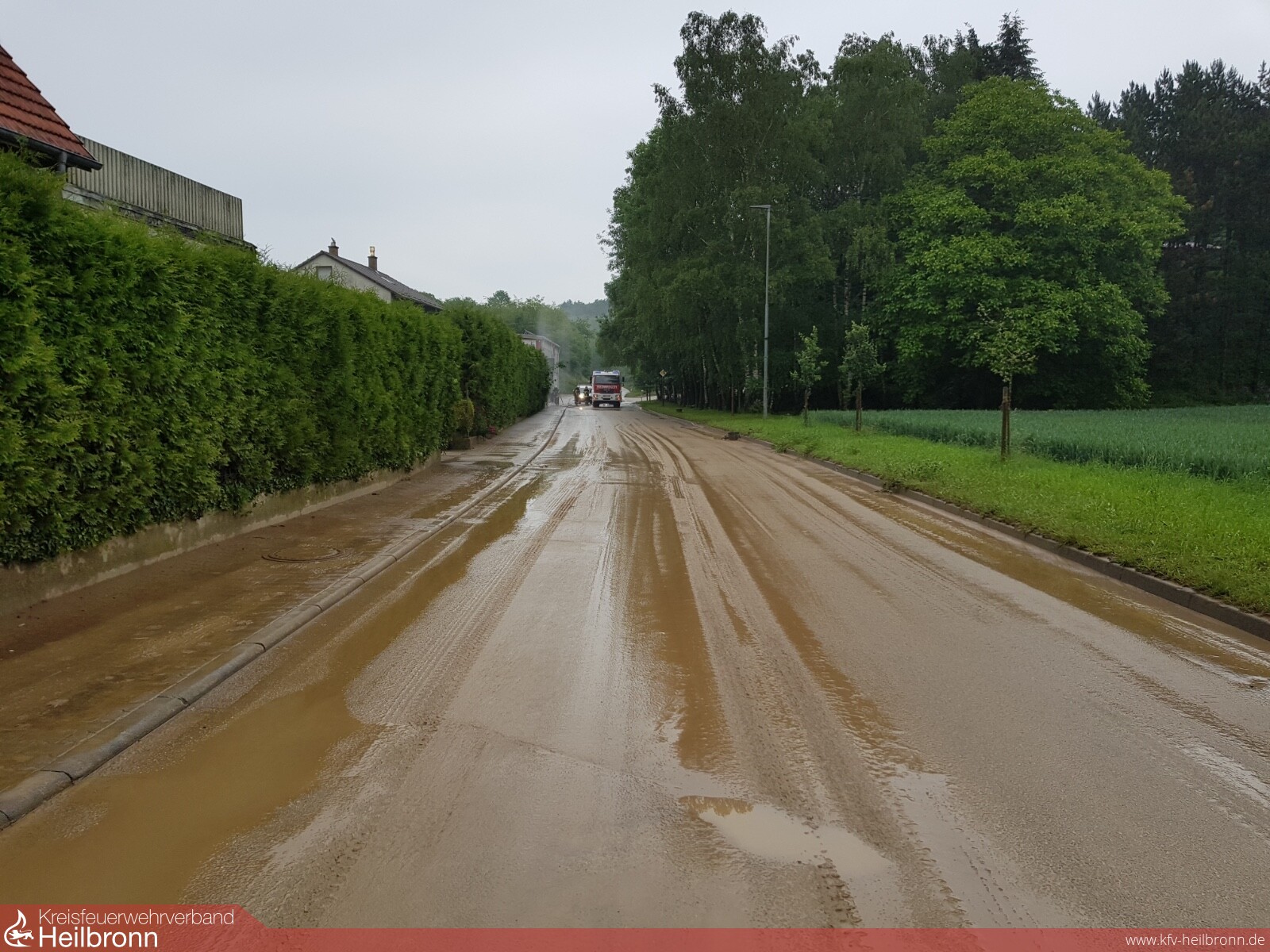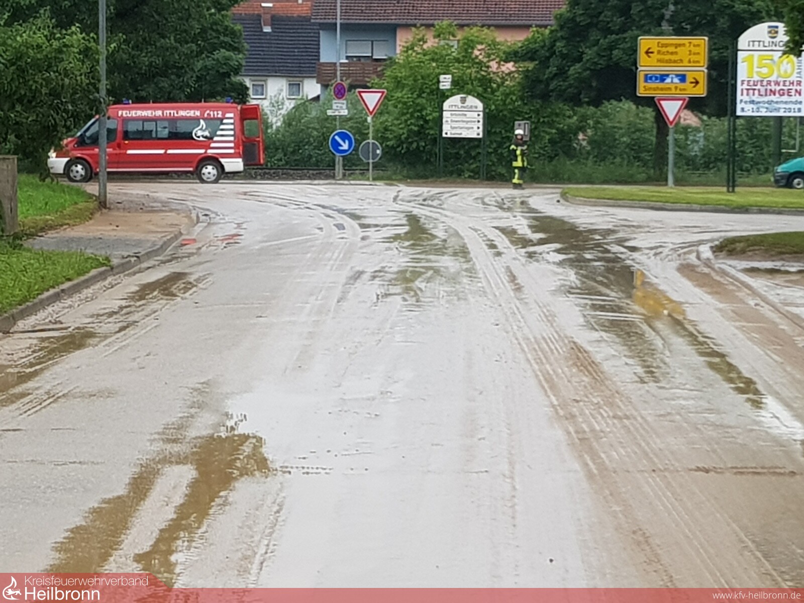 Stark betroffen waren die Reihener und Kirchardter Straße: Von der Bushaltestelle am Bahnübergang bis etwa 50 Meter hinter das Ortsschild in Richtung Kirchardt, war die Fahrbahn auf einer Länge von etwa 350 Metern mit einer Schlammschicht überzogen. Infolgedessen musste die Kirchardter Straße während der Reinigungsarbeiten für etwa drei Stunden voll gesperrt werden. Im Einsatz waren hier der MTW sowie das TLF 16/25. Im späteren Einsatzverlauf wurden die Ittlinger Kameradinnen und Kameraden spontan von der Nachbarwehr aus Kirchardt unterstützt, diese war zuvor ebenfalls unwetterbedingt im Einsatz.