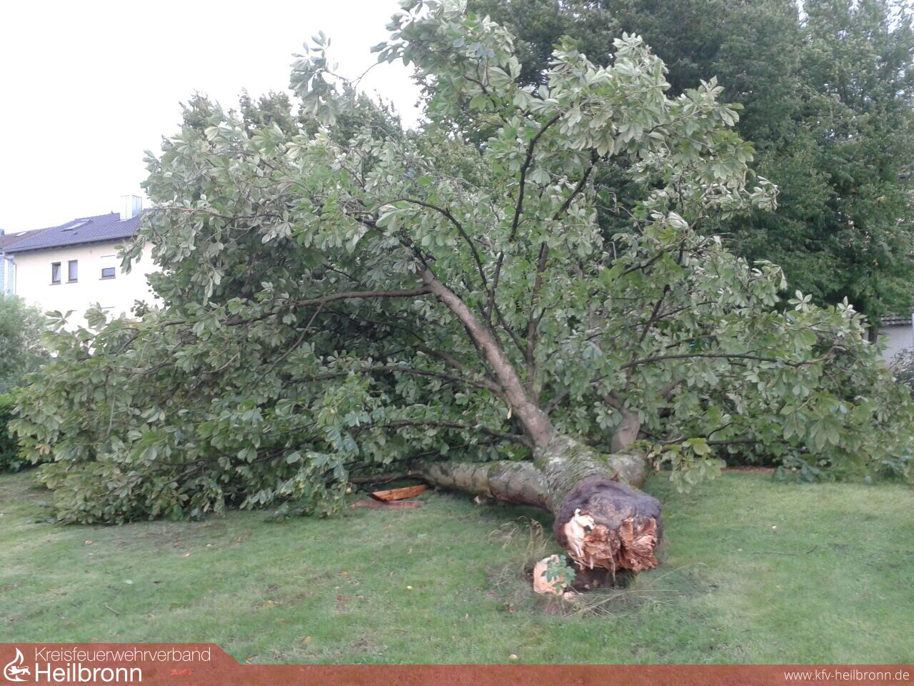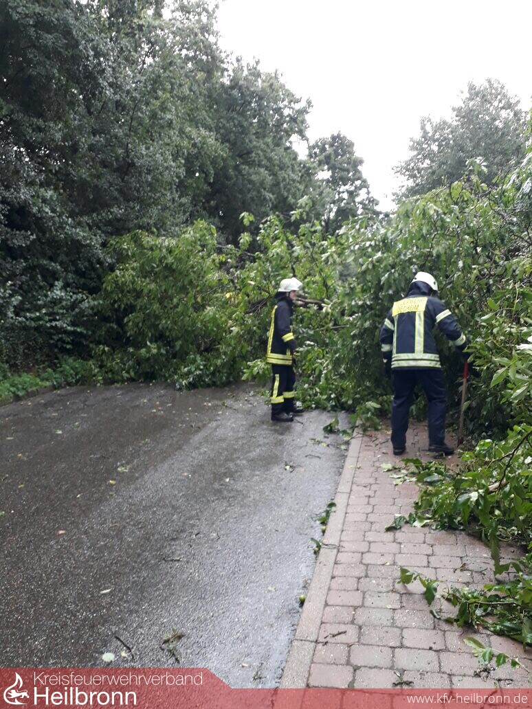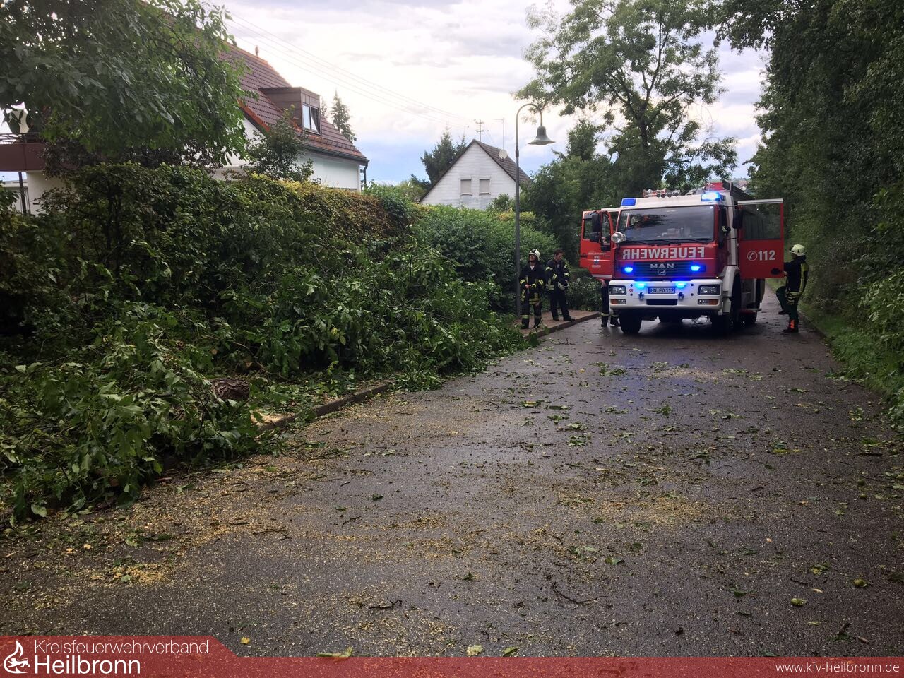 Gegen 17 Uhr zog eine Unwetterzelle mit Starkregen, Hagel und orkanartigen Sturmböen durch das Kochertal, welche neben Oedheim auch viele weitere Gemeinden traf. Bereits kurz zuvor, wurden die Kameraden zu einer ausgelösten Brandmeldeanlage in das Oedheimer Seniorenheim alarmiert. Nachdem dort kein weiterer Einsatz erforderlich war, wurde die Feuerwehr Oedheim noch auf der Rückfahrt zum Gerätehaus zum nächsten Einsatz alarmiert. Schnell häuften sich die Einsatzstellen. So wurde die Alarmierung wie im Jahr zuvor, von der ILS Heilbronn auf das Unwettermodul umgestellt. Wobei eingehende Alarme nicht mehr über Funkmelder alarmiert werden, sondern nur noch über Fax an die örtlichen Führungshäuser gesendet werden. Neben unzähligen umgestürzten Bäumen, blockierten zahlreiche Äste und umhergeflogen Gegenstände die Straßen. Des weiteren kam es im gesamten Ortsgebiet zu Straßenüberflutungen und abgedeckten Dachziegeln. An einem Wohngebäude droht die Verwahrung des Dachstuhls in eine Hauptstromleitung zu wehen. Diese konnte mit Hilfe der alarmierten Drehleiter befestigt werden. Die Feuerwehr Oedheim konnte ihren Einsatz gegen 21 Uhr beenden.