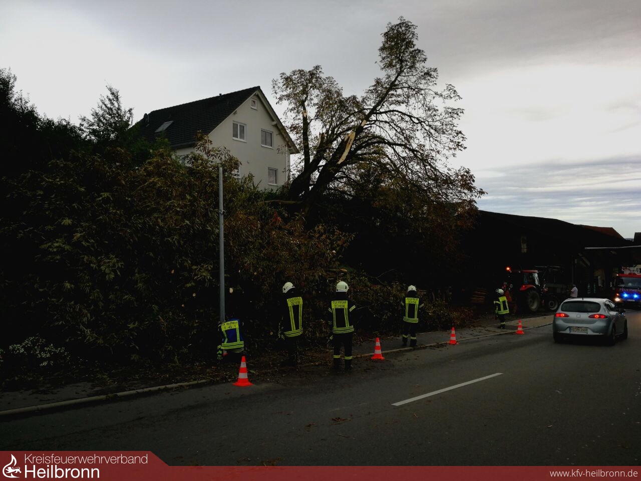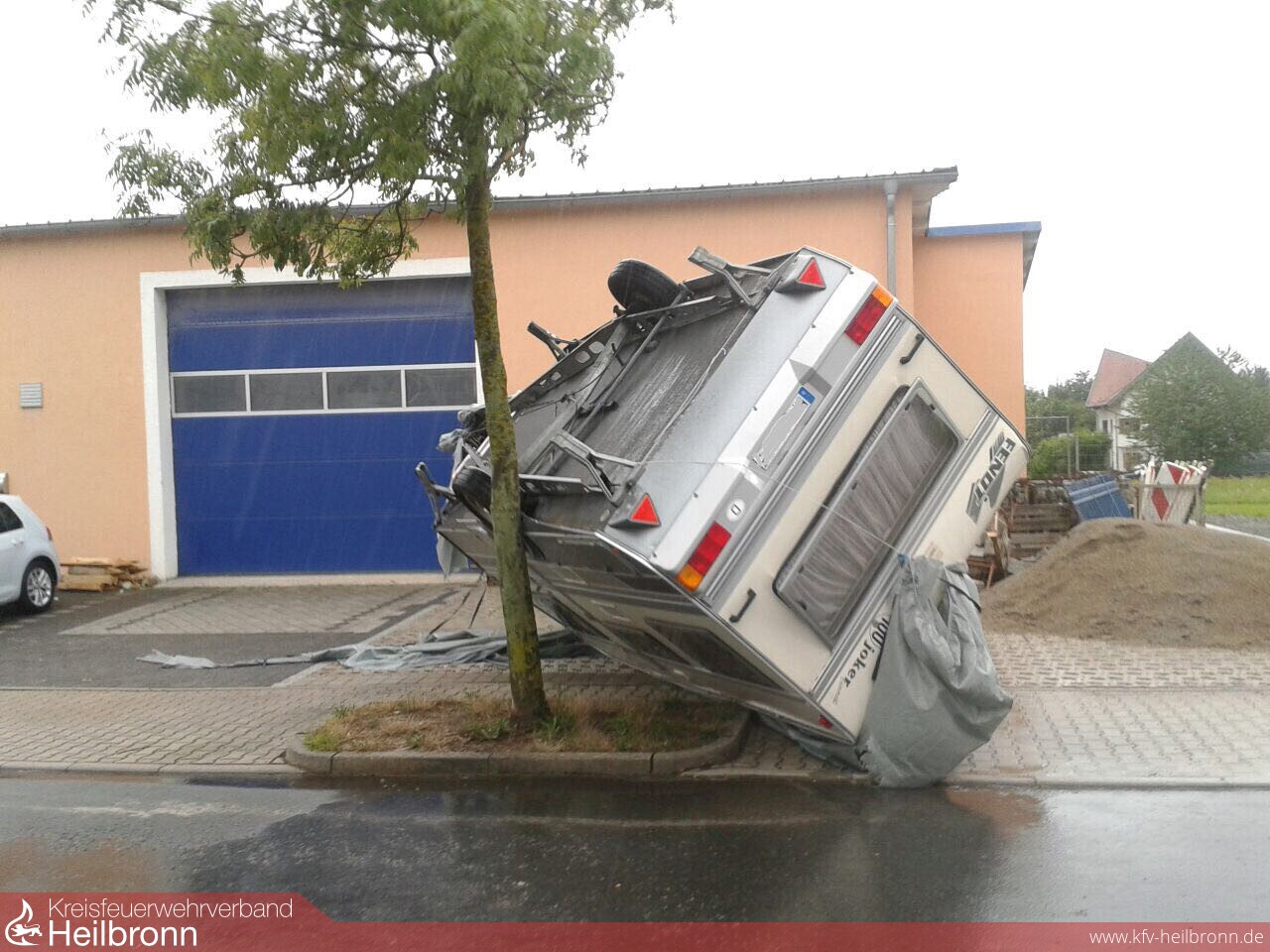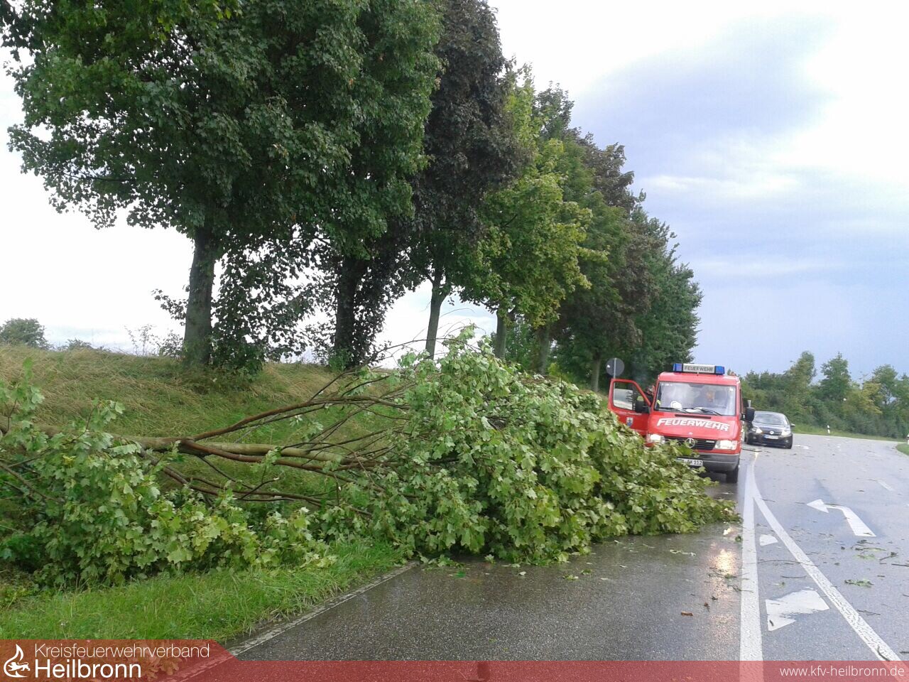 Gegen 17 Uhr zog eine Unwetterzelle mit Starkregen, Hagel und orkanartigen Sturmböen durch das Kochertal, welche neben Oedheim auch viele weitere Gemeinden traf. Bereits kurz zuvor, wurden die Kameraden zu einer ausgelösten Brandmeldeanlage in das Oedheimer Seniorenheim alarmiert. Nachdem dort kein weiterer Einsatz erforderlich war, wurde die Feuerwehr Oedheim noch auf der Rückfahrt zum Gerätehaus zum nächsten Einsatz alarmiert. Schnell häuften sich die Einsatzstellen. So wurde die Alarmierung wie im Jahr zuvor, von der ILS Heilbronn auf das Unwettermodul umgestellt. Wobei eingehende Alarme nicht mehr über Funkmelder alarmiert werden, sondern nur noch über Fax an die örtlichen Führungshäuser gesendet werden. Neben unzähligen umgestürzten Bäumen, blockierten zahlreiche Äste und umhergeflogen Gegenstände die Straßen. Des weiteren kam es im gesamten Ortsgebiet zu Straßenüberflutungen und abgedeckten Dachziegeln. An einem Wohngebäude droht die Verwahrung des Dachstuhls in eine Hauptstromleitung zu wehen. Diese konnte mit Hilfe der alarmierten Drehleiter befestigt werden. Die Feuerwehr Oedheim konnte ihren Einsatz gegen 21 Uhr beenden.