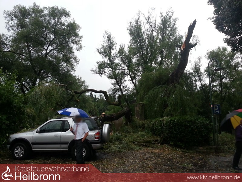 Durch das starke Gewitter und den Sturm wurde ein Teil der großen Weide am Kriegerdenkmal abgerissen und stürzte auf ein parkendes Fahrzeug auf dem angrenzenden Parkplatz.