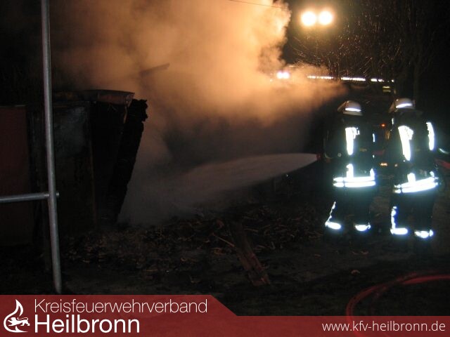 Das Feuer wurde von einem Trupp unter Atemschutz abgelöscht. Im Verlauf der Löscharbeiten wurden in der Hütte - mit Hilfe der Wärmebildkamera - drei Gasflaschen aufgefunden, geborgen und in sicherer Entfernung gekühlt.