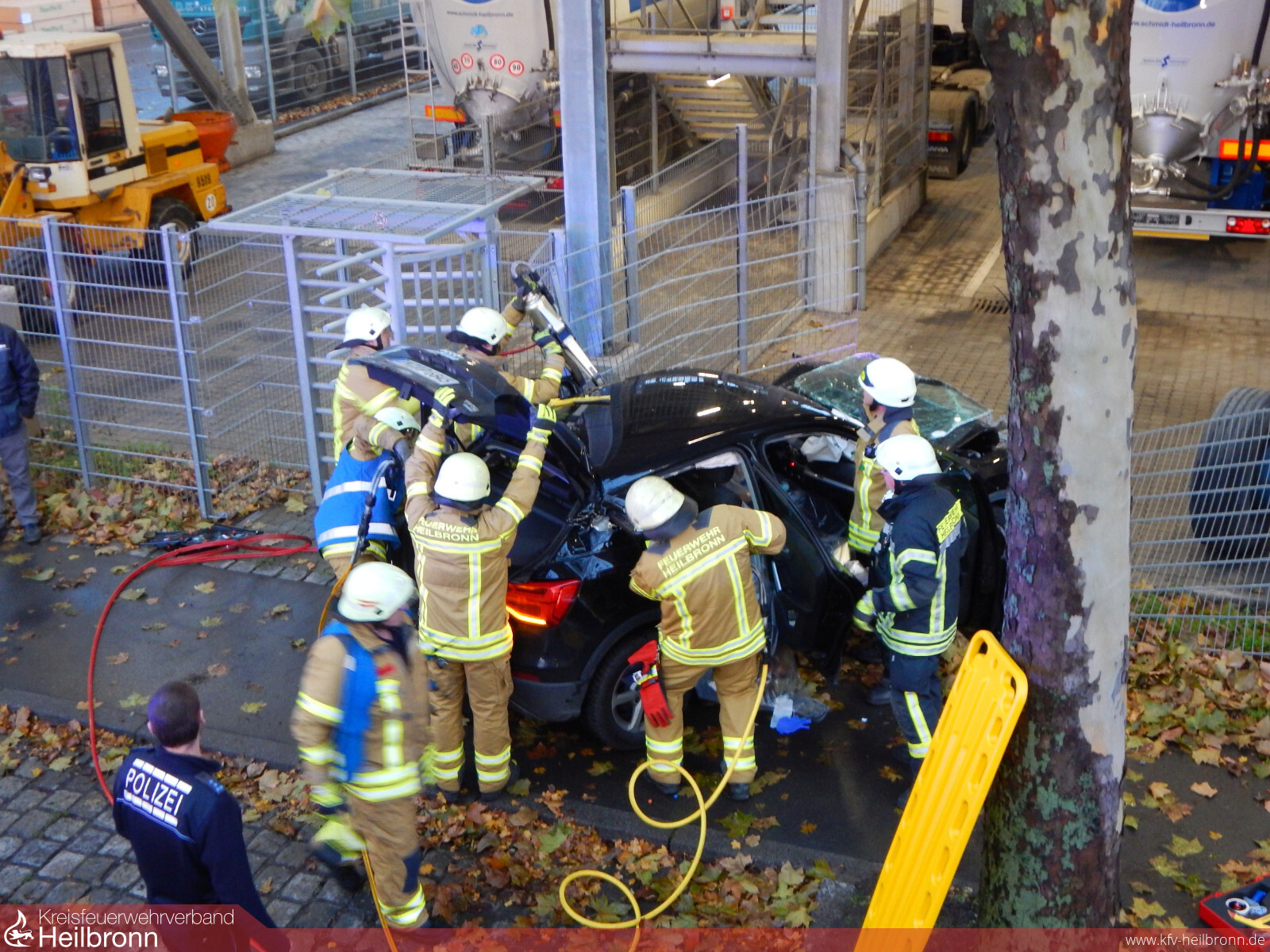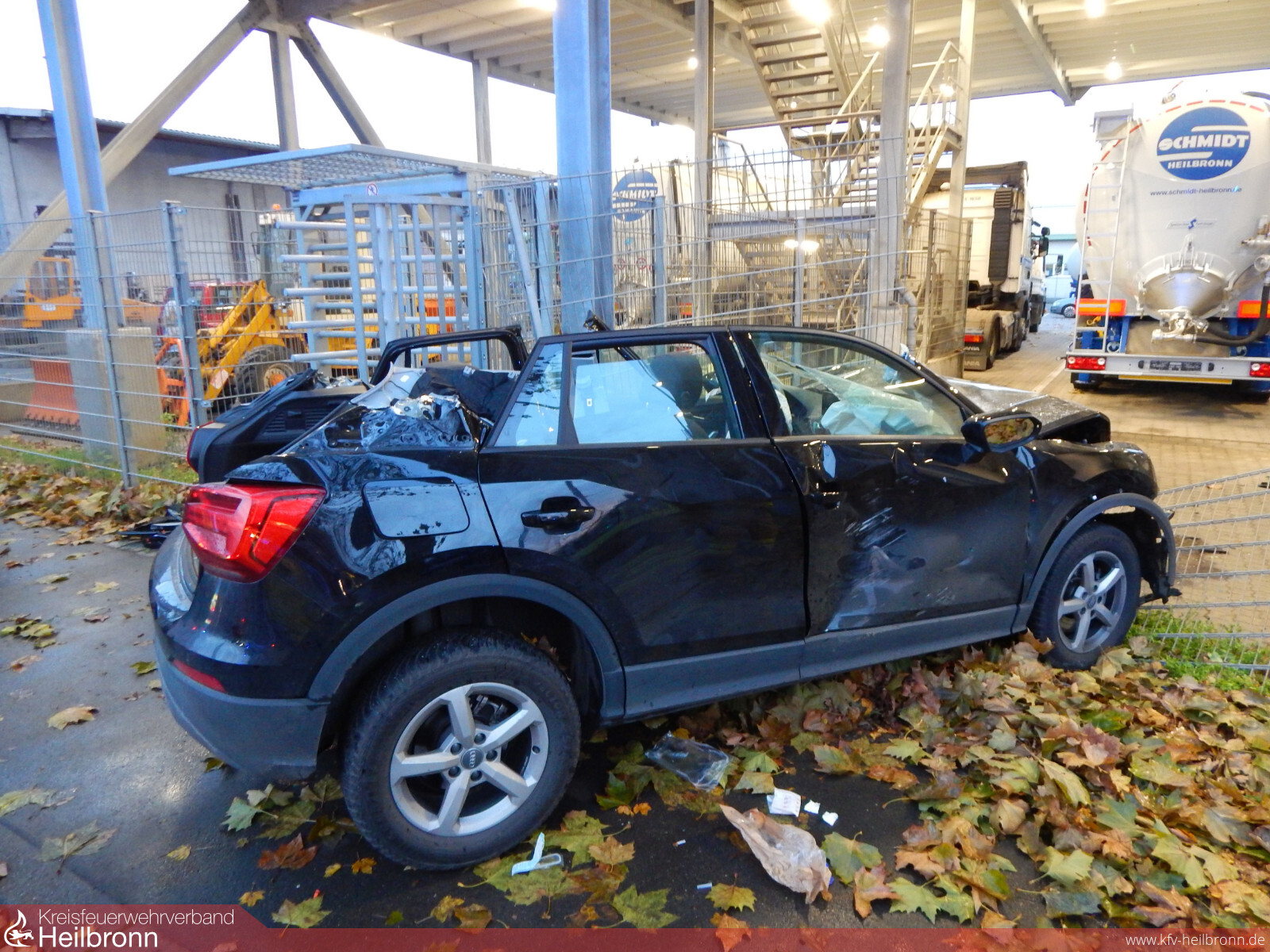 An der Einsatzstelle waren ein Audi sowie ein Mercedes zusammengeprallt. Während der Mercedes schwer beschädigt auf der Austraße zum Stehen kam, wurde der Audi in einen Gitterzaun eines anliegenden Firmengeländes geschleudert.
