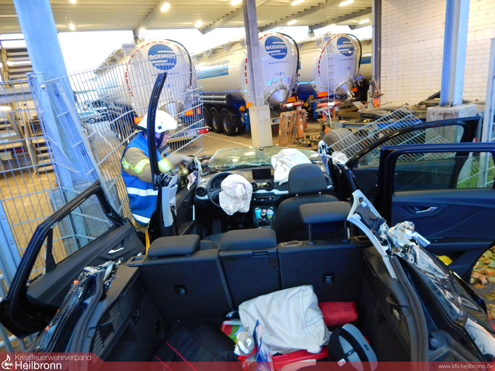 Da der im Audi eingeschlossene Fahrer über starke Schmerzen im Beinbereich klagte, wurde das Dach mit Hilfe von hydraulischen Rettungsgeräten abgenommen. Hierdurch war es möglich eine patientengerechte Rettung mit einem Spineboard durchzuführen.