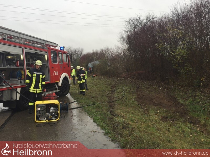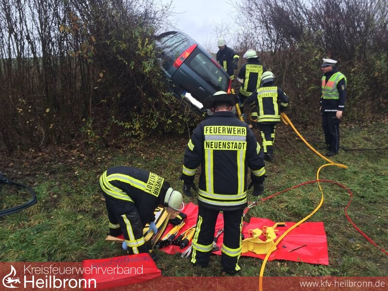 Bei starkem Regen fuhr ein PKW nach rechts von der Fahrbahn der Autobahn in den aufgeweichten Grünstreifen und anschließend in die bepflanzte Böschung. Das Fahrzeug kam erst nach einer längeren Fahrt durch Büsche im Winkeln von 90° zur Fahrbahn zum Stehen. Der Fahrer war in seinem Fahrzeug eingeklemmt und wurde von der Feuerwehr Neuenstadt über die aufgespreizte Beifahrertüre befreit und gemeinsam mit dem Rettungsdienst aus dem Fahrzeug gehoben. Da sich das Fahrzeug in starker Schräglage befand, musste es zuvor gegen Kippen gesichert werden.