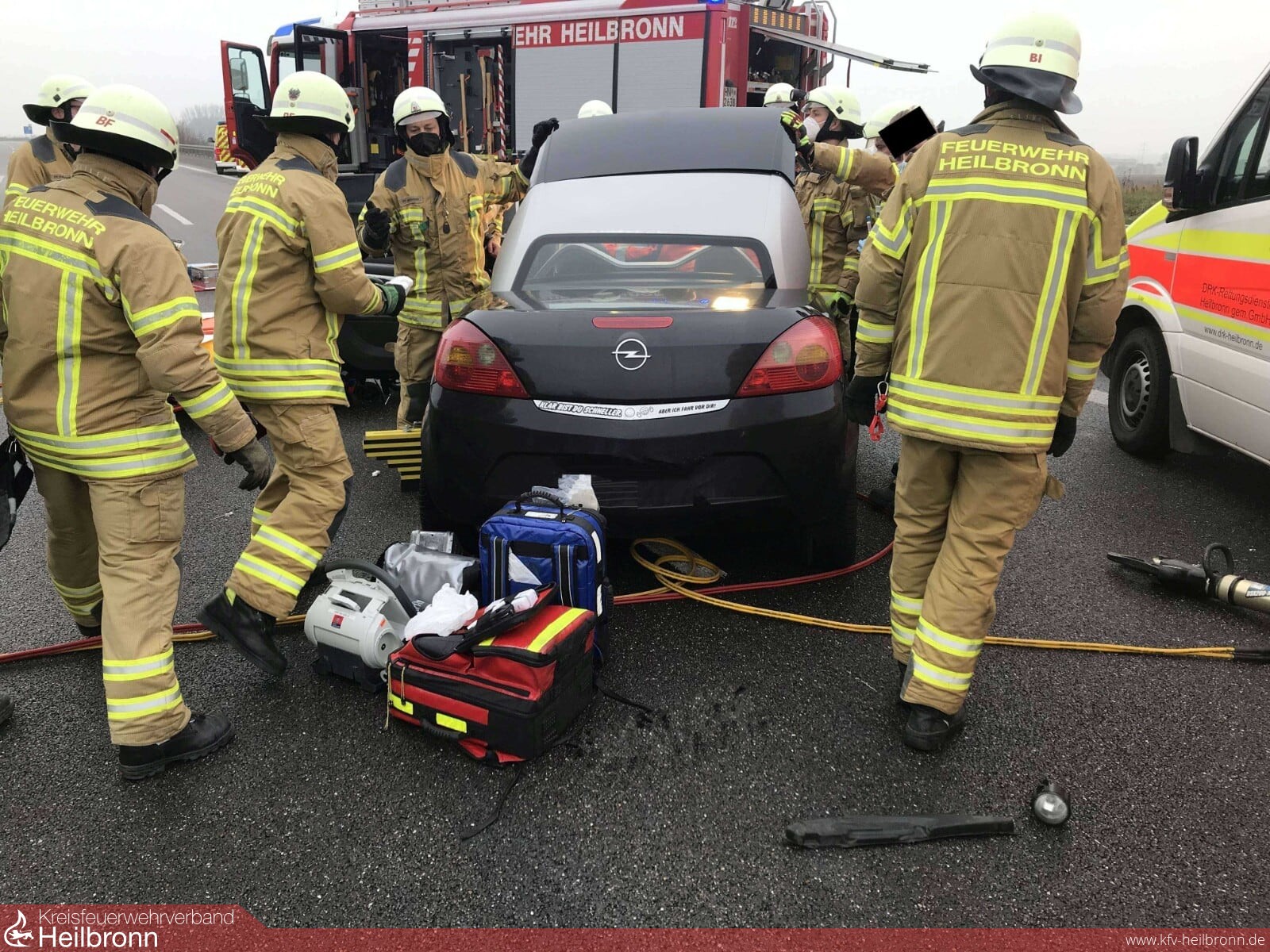 Um 11.14 Uhr rückte die Feuerwehr Heilbronn heute zu einem Verkehrsunfall auf die Autobahn 6 in Fahrtrichtung Nürnberg aus. Vor Ort war eine Person mit Verdacht auf ein Wirbelsäulentrauma in einem Cabriolet eingeschlossen. Die Einsatzkräfte führten eine schonende und patientengerechte Rettung mit Hilfe eines Spineboardes durch. Aufgrund der niedrigen Temperaturen wurde der Patient während der Rettungsmaßnahmen mit Scheinwerfern gewärmt.