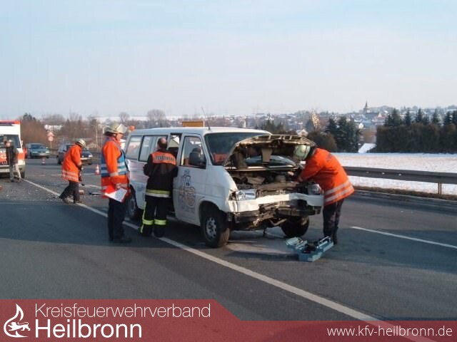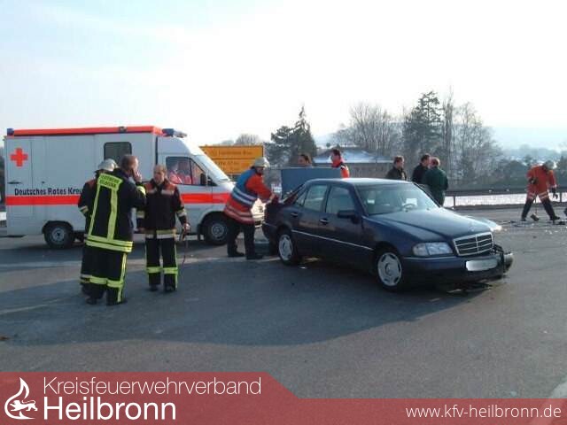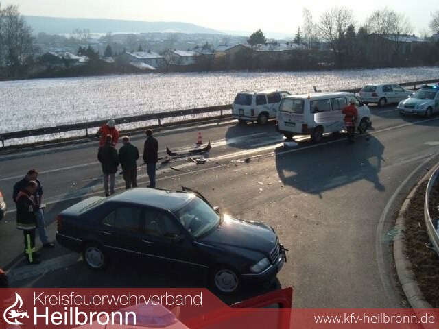 Gegen 16:00 Uhr am Donnerstag Nachmittag ereignete sich auf dem Leingartener Abschnitt der B 293 ein Verkehrsunfall. Auf Höhe der Abfahrt Leingarten ? Kirchhausen kam es zum Zusammenstoß zwischen einem Mercedes und einem VW- Transporter, wobei deren Fahrer verletzt wurden.