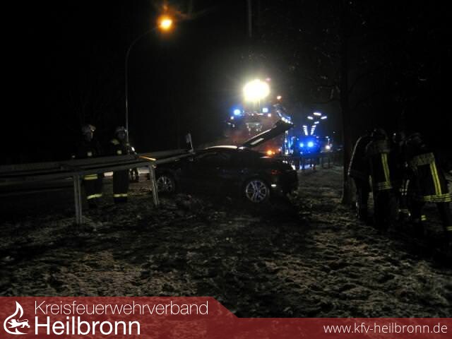 Um 03:48 Uhr wurde die Feuerwehr Neckarsulm zu einem Verkehrsunfall auf der B27 auf Höhe des Kreuzungsbauwerks Nord alarmiert. Der Fahrer eines Audi TT hat von Bad Friedrichshall kommend die Kontrolle über sein Fahrzeug verloren und rutschte über eine ca. 50 m breite Grünfläche bis er letztendlich frontal in eine Leitplanke prallte.