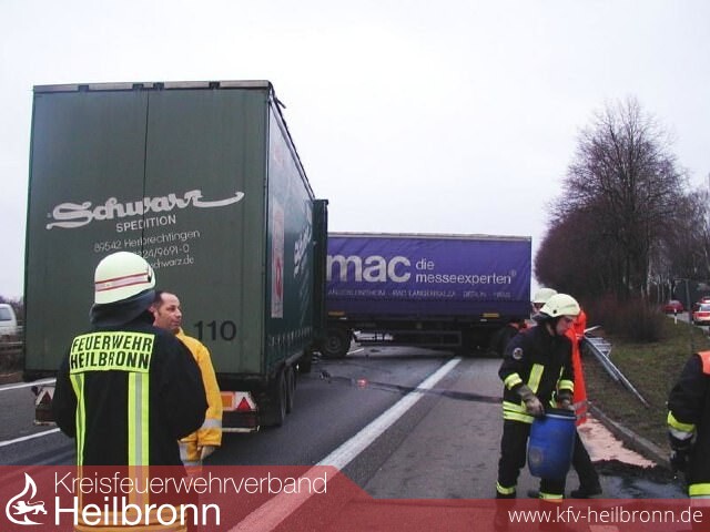 Zu einem Auffahrunfall mit fünf beteiligten Lastwagen und Sattelzügen kam es in den Nachmittagsstunden auf der A 6 zwischen den Anschlussstellen Heilbronn/ Obereisesheim und Bad Rappenau.