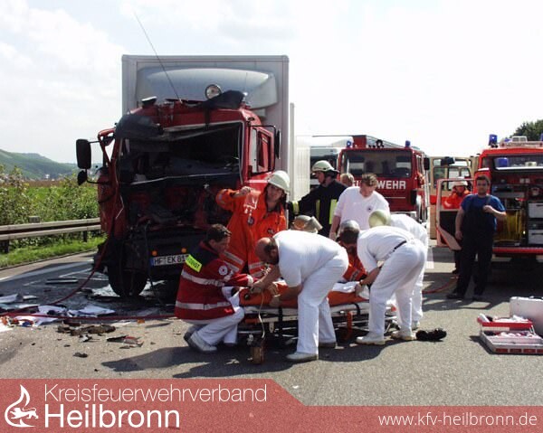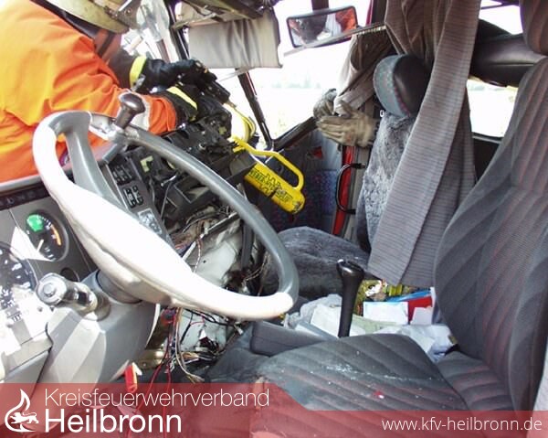 Bei einem Verkehrsunfall am 03.09.2002 um 12:08 Uhr zwischen zwei Lastzügen, wurde der Fahrer des auffahrenden Fahrzeuges in seinem Führerhaus eingeklemmt.