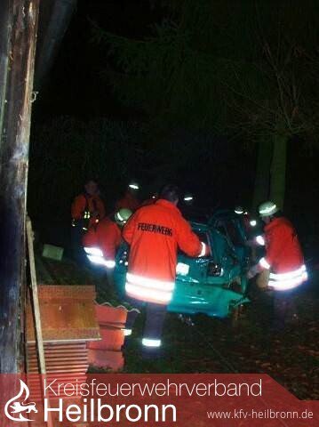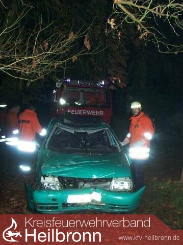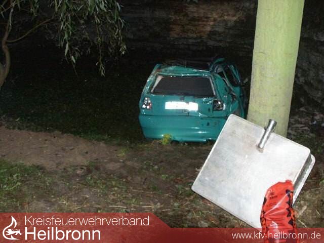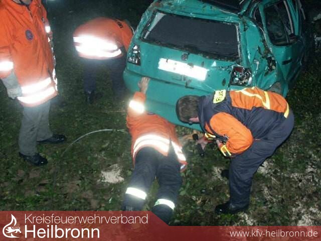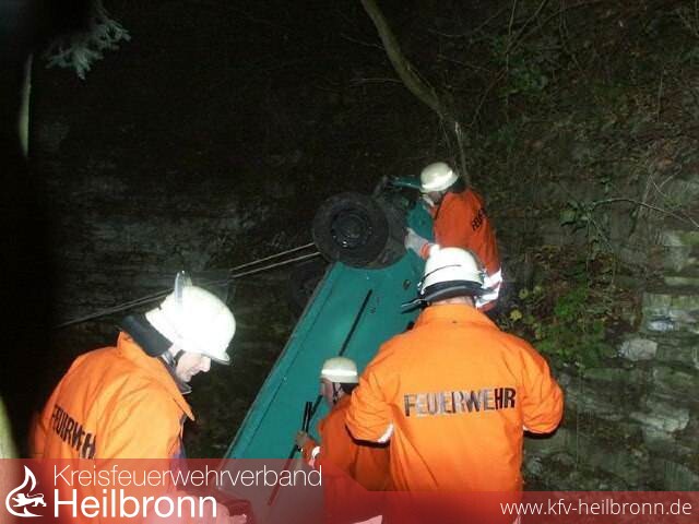 Auf der Gemeindeverbindungsstraße zwischen Oedheim und Degmarn kam ein Fahrzeug von der Fahrbahn ab und stürzte eine ca. 10 m hohe steile, mit Natursteinen gefasste Böschung hinab und blieb in unwegsamem Gelände senkrecht auf dem Heck des Fahrzeugs an der Mauer stehen.