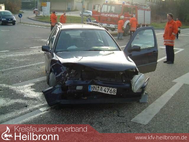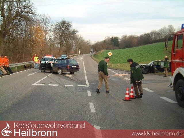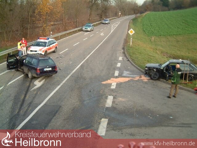 Am Samstag, den 22.11.2003 kam es auf der K 2160 zwischen Schwaigern und Leingarten an der Einmündung der Industriestraße zu einem Zusammenstoß von zwei PKW. Dabei wurde ein Beifahrer schwer, vier weitere Insassen leicht verletzt.