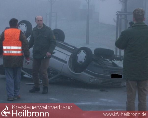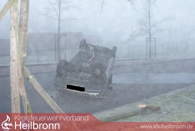 Eine PKW- Fahrerin fuhr aus der Siedlung Plattenwald die Abfahrt Richtung Kreisstraße. Auf eisglatter Fahrbahn kam das Fahrzeug in einer Kurve in der Abfahrt vor dem Kreisel von der Fahrbahn ab, prallte gegen einen Baum, stürzte um und blieb auf dem Dach liegen. Die Fahrerin konnte sich selbst befreien.