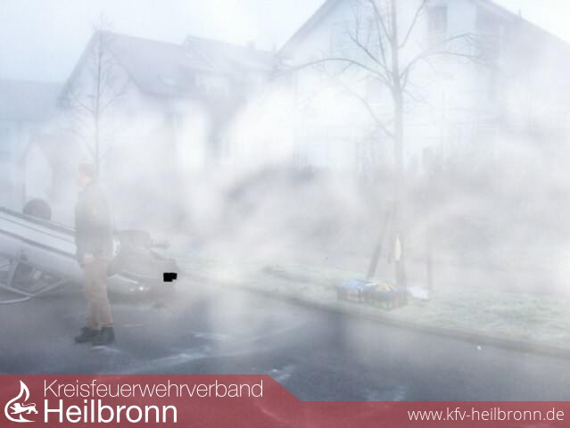 Aus dem Fahrzeug lief eine größere Menge Benzin aus und gelang zum Teil in einen Straßeneinlauf. Ein städt. Mitarbeiter und Feuerwehrmann, der sich in unmittelbarer Nähe des Unfallorts befand, verhinderte durch errichten eines Walls mit Streusalz, dass weiteres Benzin in den Einlauf floss. Über Handy alarmierte er Feuerwehr und Polizei.