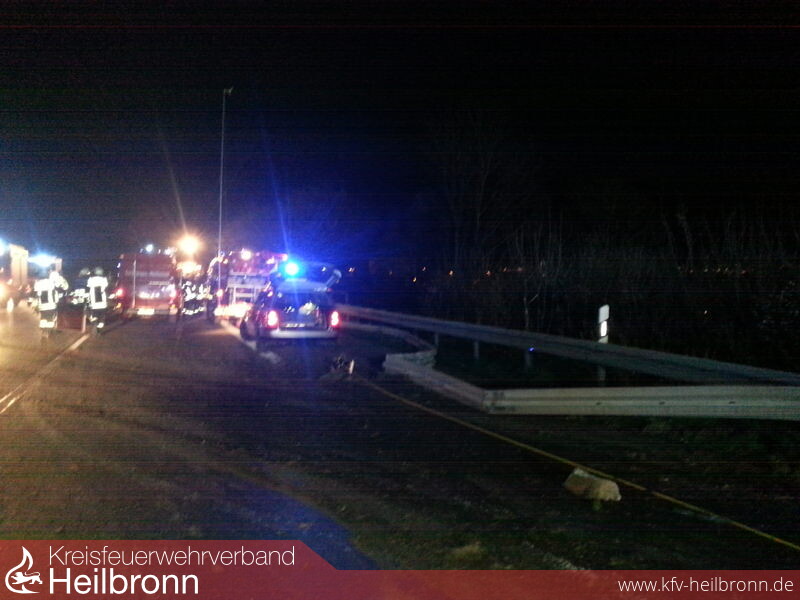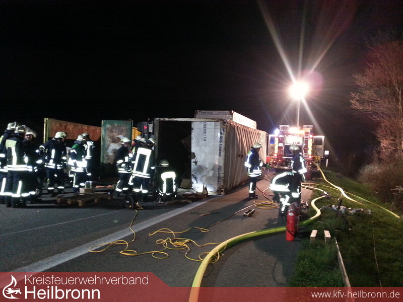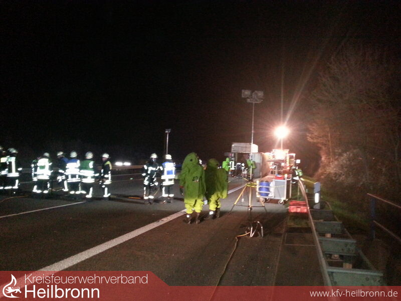 Nach der Alarm- und Ausrückeordnung werden bei Unfällen mit gefährlichen Stoffen und Gütern gleich mehrere Feuerwehren alarmiert. Neben der Feuerwehr Ilsfeld alarmierte die integrierte Leitstelle in Heilbronn die Feuerwehr Lauffen mit dem Gerätewagen-Messtechnik, den Gefahrgutzug der Feuerwehr Weinsberg, den Fachberater Chemie des Landkreises Heilbronn sowie den Kreisbrandmeister. Nach dem Eintreffen der ersten Einsatzkräfte an der Einsatzstelle wurde die Autobahn für den Verkehr voll gesperrt. Der Gefahrenbereich wurde abgesperrt und der Brandschutz sichergestellt. Zur weiteren Lageerkundung musste der Anhänger mit hydraulischem Rettungsgerät geöffnet werden. Auf Grund der im Anhänger umgestürzten Ladung ließ sich das Rolltor des Anhängers nicht vollständig öffnen. Die eingesetzten Kräfte waren mit umluftunabhängigen Atemschutzgeräten ausgerüstet. Zusätzlich gingen zwei Trupps mit einem Chemikalienschutzanzug zur Lageerkundung vor. Durch den Fachberater Chemie wurden mehrere Messungen vorgenommen und das Belüften des Anhängers angewiesen.