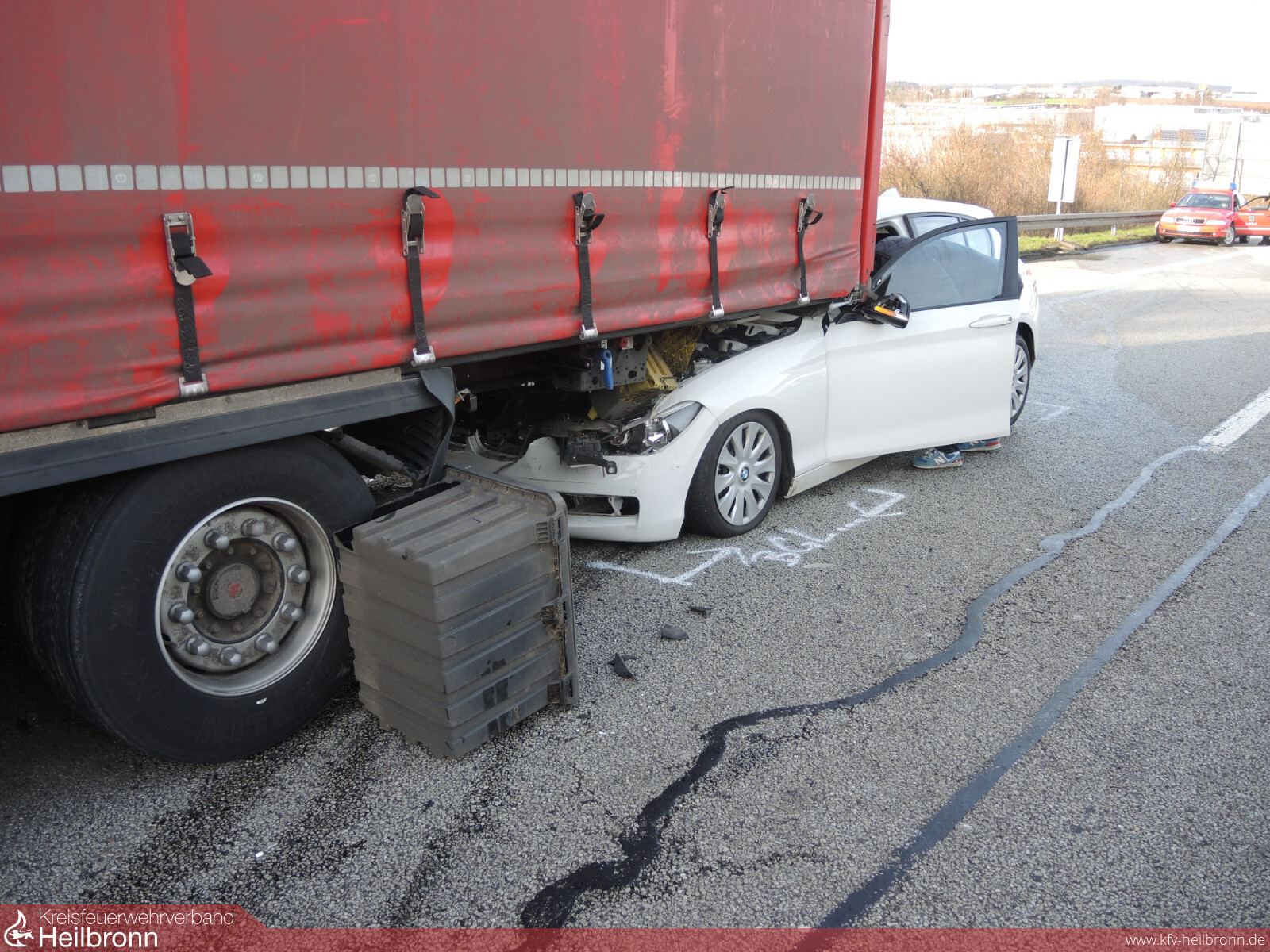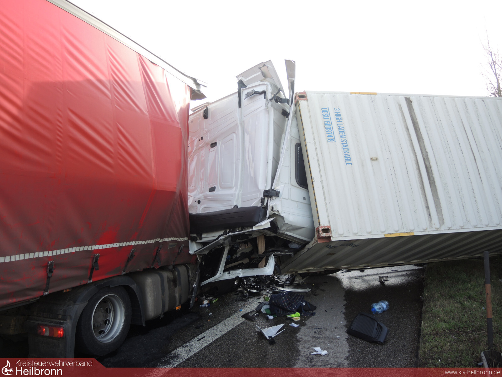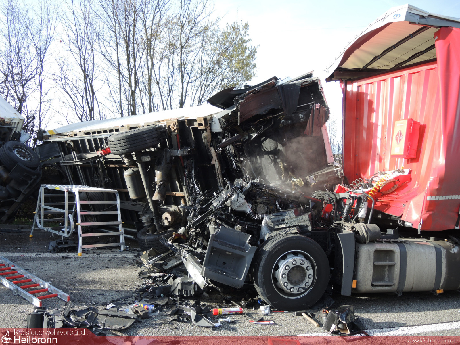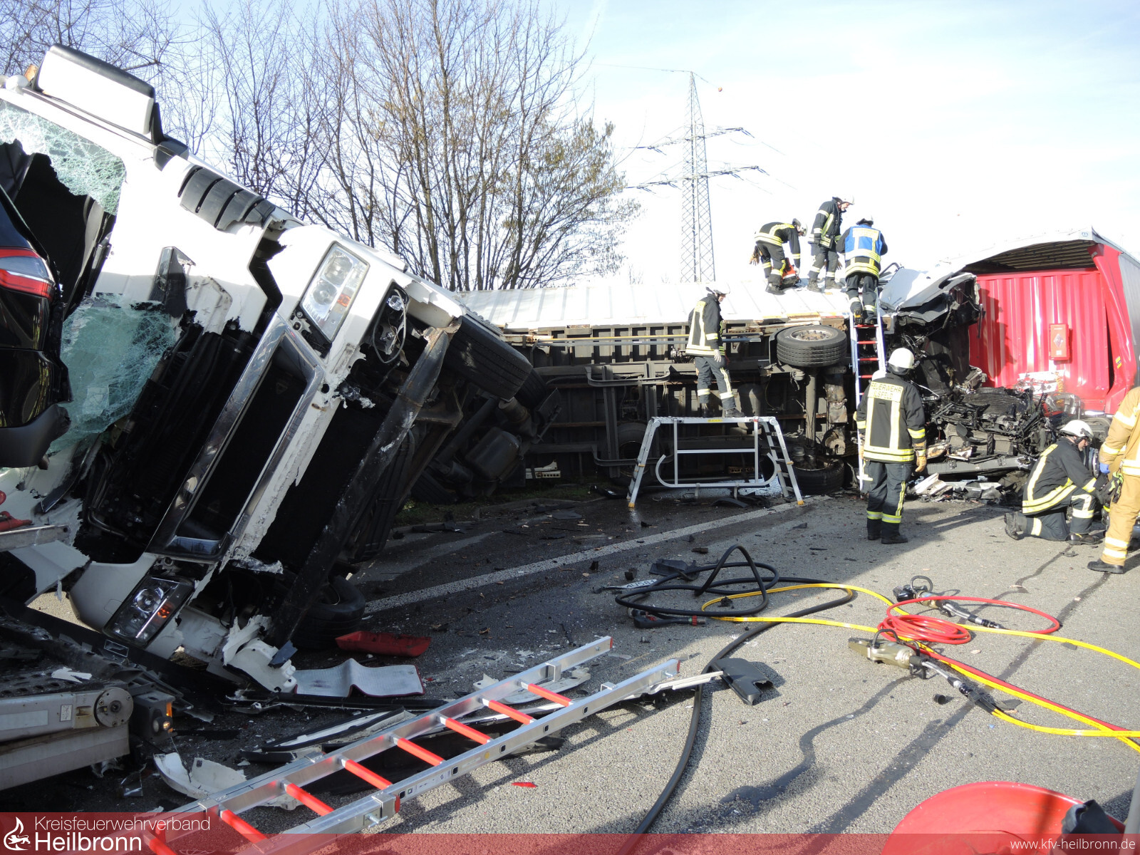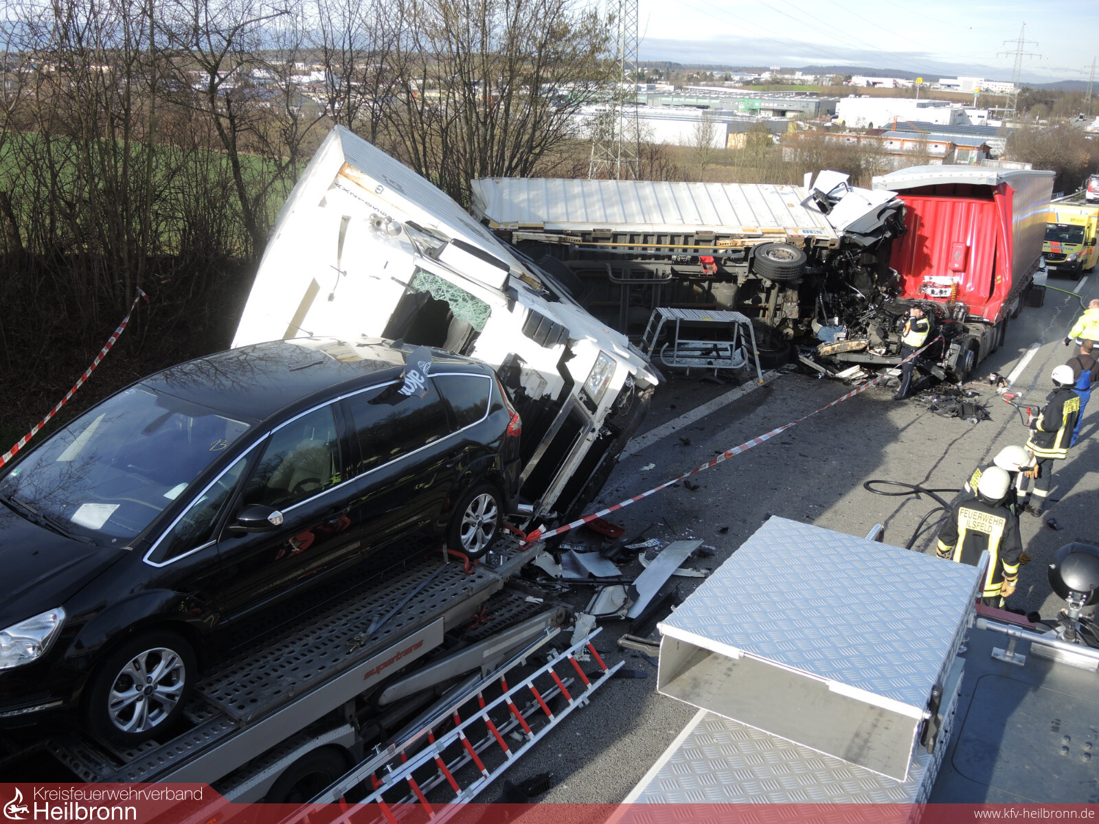 Die Feuerwehr Ilsfeld und die Berufsfeuerwehr Heilbronn wurde auf die A81 in Fahrtrichtung Stuttgart mit dem Alarmstichwort VU LKW 2 eingeklemmten Personen alarmiert. Beim Eintreffen an der Einsatzstelle bot sich ein Bild des Schreckens. Laut Angaben der Polizei, fuhr erst ein Lastwagen auf zwei Fahrzeuge am Stauende auf, danach fuhr ein weiterer Lastwagen auf den ersten Lkw.Der erste Laster prallte mitsamt Anhänger derart heftig auf den Autotransporter, so dass dieser auf ein weiteres Fahrzeug geschoben wurde. Der Fahrer eines nachfolgenden Sattelzuges erkannte die Unfallstelle vermutlich ebenfalls nicht oder viel zu spät und fuhr wohl ungebremst in die Unfallstelle. Der Aufprall muss dabei so heftig gewesen sein, dass der Lastwagen und dessen Anhänger umstürzte und die Führerkabine des auffahrenden Sattelzugs heruntergerissen wurde. Der Sattelzuganhänger blieb auf dem rechten Fahrstreifen stehen und wurde dadurch einer Autofahrerin zum Verhängnis. Sie fuhr auf den Lkw Anhänger auf.