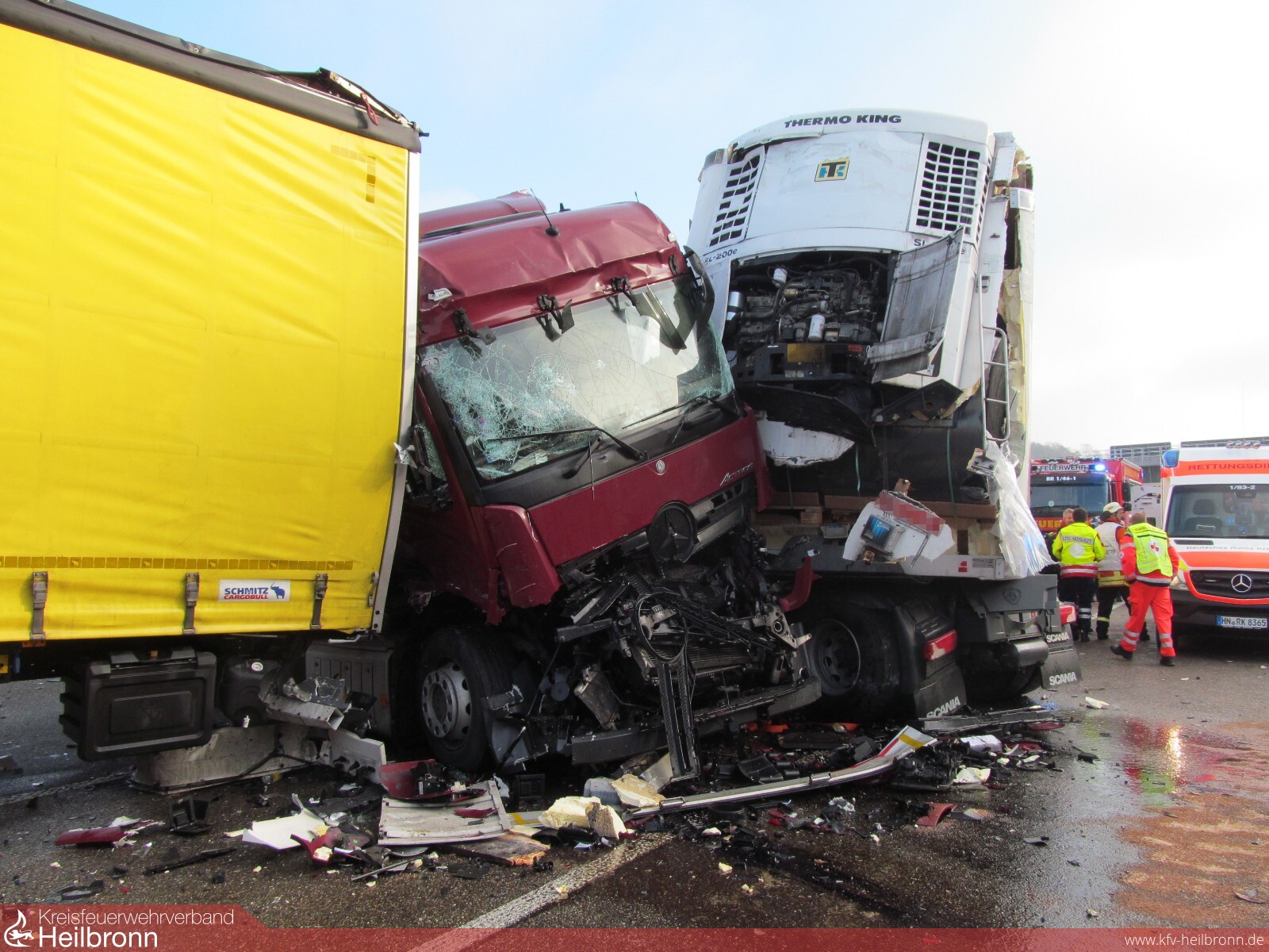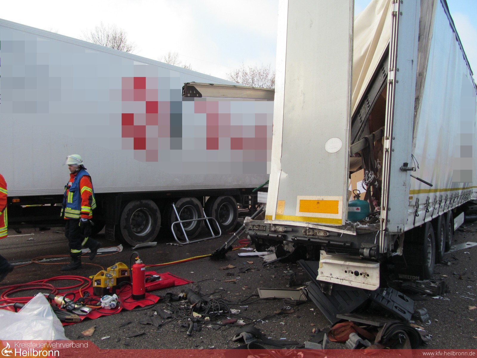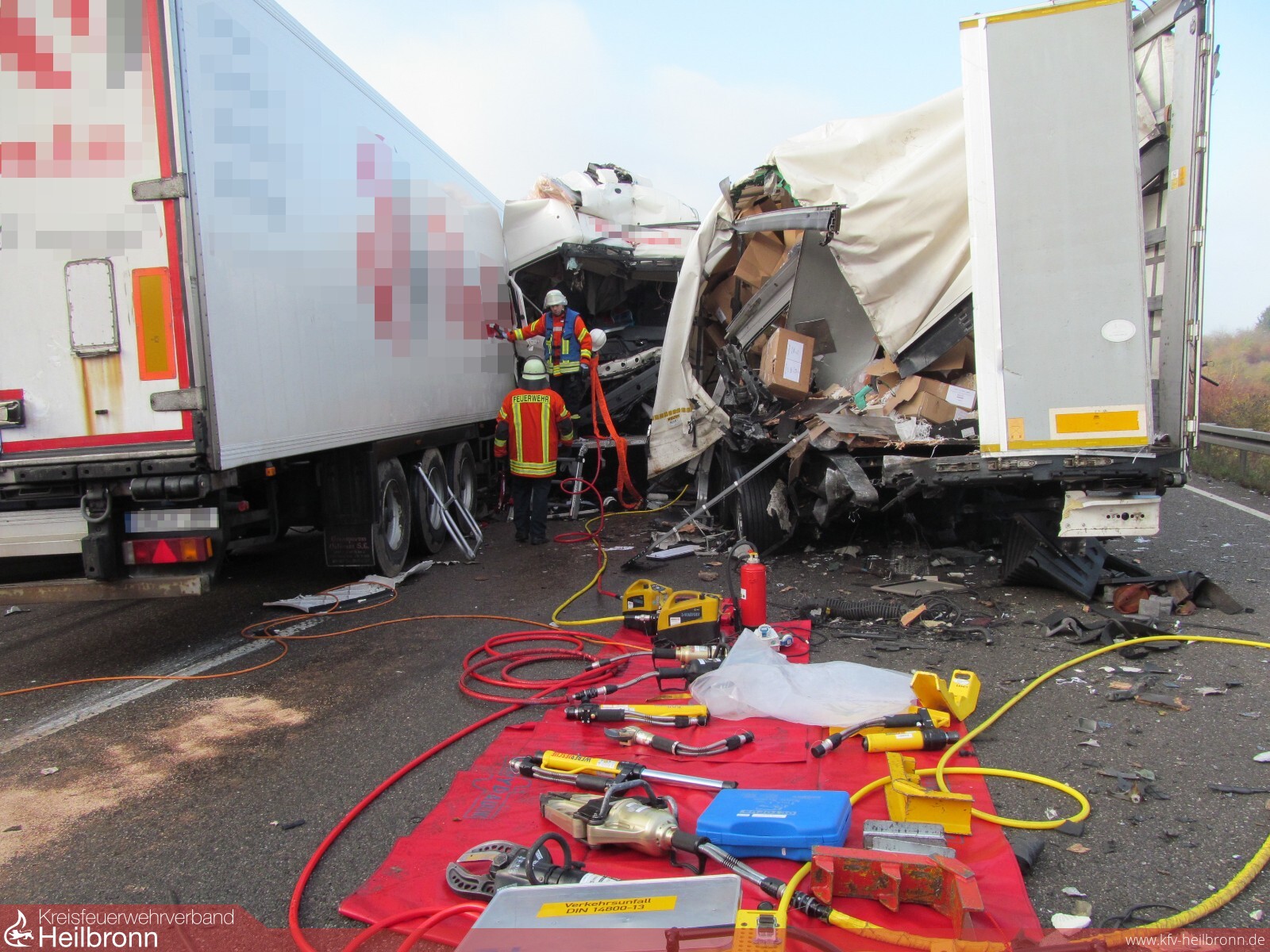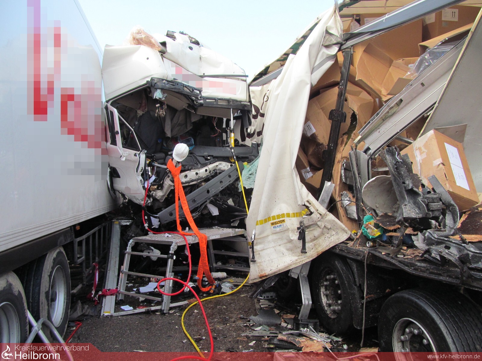 Mit dem Alarmstichwort „Verkehrsunfall LKW“ wurde die Freiwillige Feuerwehr Bad Rappenau auf die Bundesautobahn 6 in Fahrtrichtung Mannheim alarmiert. Zwischen den Anschlussstellen Bad Rappenau und Sinsheim-Steinsfurt hatte sich gegen 10 Uhr in Richtung Mannheim ein Stau gebildet. Nach dem derzeitigen Stand der Ermittlungen hatten drei Trucker ihre Sattelzüge kurz vor der Ausfahrt Sinsheim-Steinsfurt bereits bis zum Stillstand abgebremst. Ein vierter Fahrer bemerkte das Stauende offenbar zu spät, so dass sein Zugfahrzeug mit großer Wucht gegen das Heck eines Sattelzuges prallte. Dieser wurde auf den davor stehenden Truck geschoben, der dann noch gegen das Heck eines weiteren Lasters gestoßen wurde. Dabei wurde der Fahrer des auffahrenden Sattelzugs eingeklemmt. Die Feuerwehren Sinsheim und Heilbronn fuhren von der Anschlussstelle Sinsheim-Steinsfurt entgegengesetzt der Fahrtrichtung auf die Autobahn auf. Direkt nach dem Eintreffen an der Einsatzstelle begann die Feuerwehr einen Notzugang für den Notarzt mittels hydraulischem Rettungsgerät zu schaffen, damit der Notarzt den eingeklemmten Fahrer versorgen konnte. Anschließend wurde dieser aus seiner Zugmaschine befreit und dem Rettungsdienst übergeben. Nach der Rettung des Fahrers sicherte die Feuerwehr noch auslaufende Betriebsmittel. Der eingeklemmte LKW-Fahrer erlitt lebensgefährliche Verletzungen und wurde von einem Rettungshubschrauber in eine Spezialklinik geflogen. Der Fahrer des zweiten LKW erlitt schwere, der des davor stehenden Sattelzuges leichte Verletzungen. An zwei der LKW entstand Totalschaden. Die Höhe des Sachschadens liegt wohl im sechsstelligen Euro-Bereich. Die A6 musste bis in die Abendstunden voll gesperrt werden. Die Freiwillige Feuerwehr Bad Rappenau war mit 5 Fahrzeugen und 22 Mann im Einsatz. Die Feuerwehren Sinsheim und Heilbronn waren zusätzlich mit 9 Fahrzeugen und 24 Mann im Einsatz.