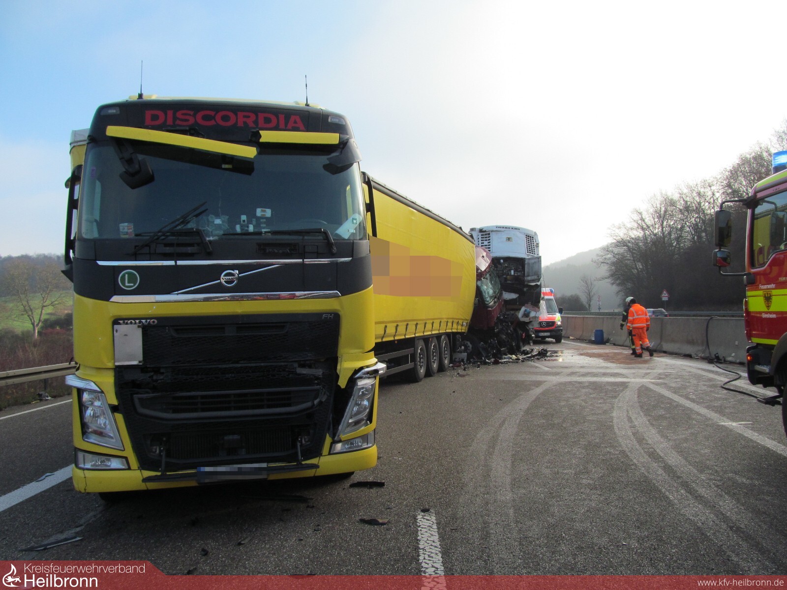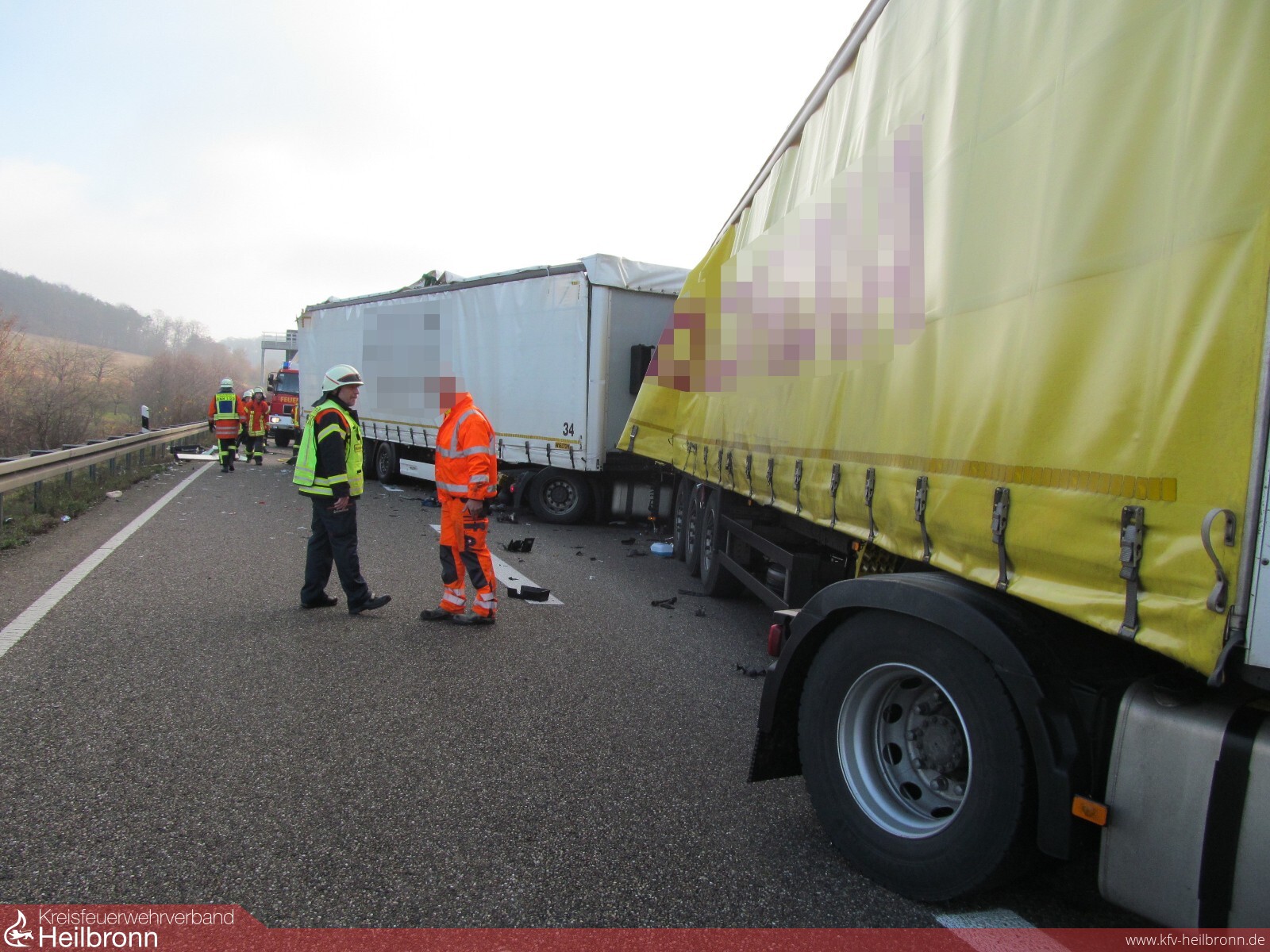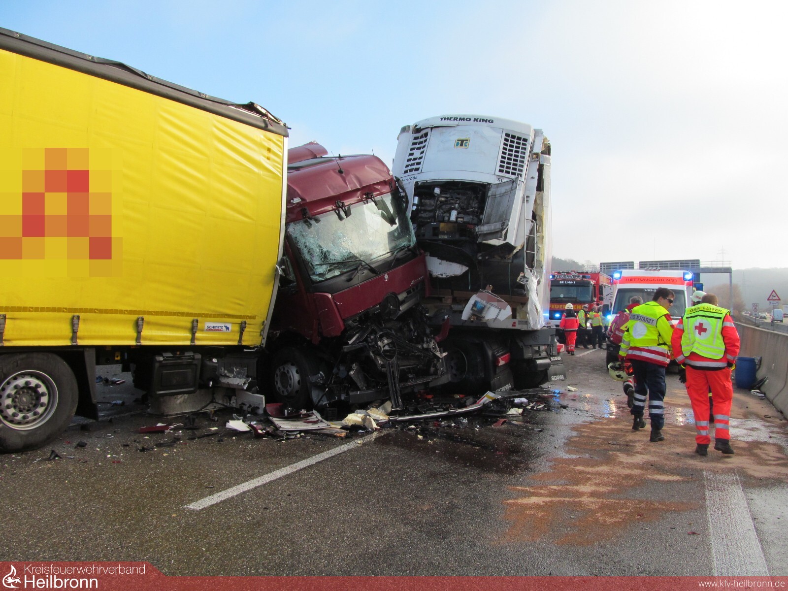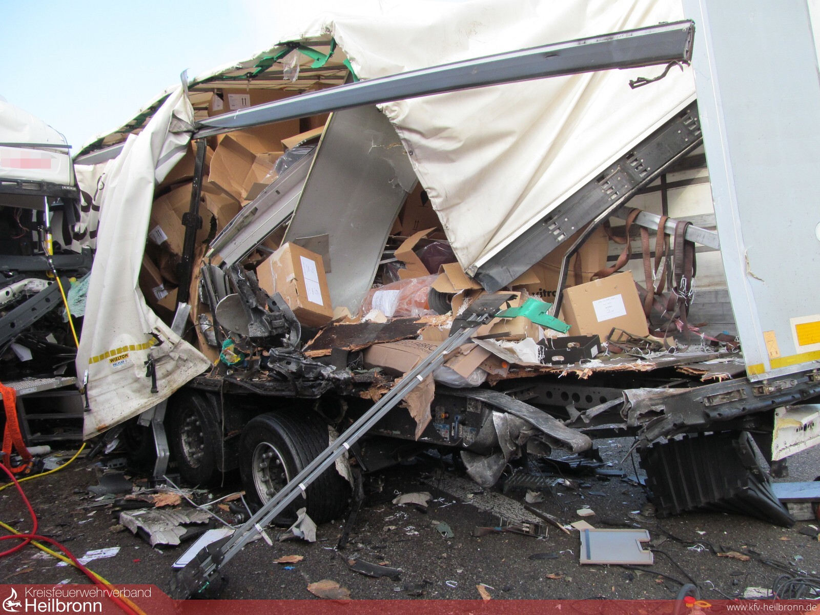 Mit dem Alarmstichwort „Verkehrsunfall LKW“ wurde die Freiwillige Feuerwehr Bad Rappenau auf die Bundesautobahn 6 in Fahrtrichtung Mannheim alarmiert. Zwischen den Anschlussstellen Bad Rappenau und Sinsheim-Steinsfurt hatte sich gegen 10 Uhr in Richtung Mannheim ein Stau gebildet. Nach dem derzeitigen Stand der Ermittlungen hatten drei Trucker ihre Sattelzüge kurz vor der Ausfahrt Sinsheim-Steinsfurt bereits bis zum Stillstand abgebremst. Ein vierter Fahrer bemerkte das Stauende offenbar zu spät, so dass sein Zugfahrzeug mit großer Wucht gegen das Heck eines Sattelzuges prallte. Dieser wurde auf den davor stehenden Truck geschoben, der dann noch gegen das Heck eines weiteren Lasters gestoßen wurde. Dabei wurde der Fahrer des auffahrenden Sattelzugs eingeklemmt. Die Feuerwehren Sinsheim und Heilbronn fuhren von der Anschlussstelle Sinsheim-Steinsfurt entgegengesetzt der Fahrtrichtung auf die Autobahn auf. Direkt nach dem Eintreffen an der Einsatzstelle begann die Feuerwehr einen Notzugang für den Notarzt mittels hydraulischem Rettungsgerät zu schaffen, damit der Notarzt den eingeklemmten Fahrer versorgen konnte. Anschließend wurde dieser aus seiner Zugmaschine befreit und dem Rettungsdienst übergeben. Nach der Rettung des Fahrers sicherte die Feuerwehr noch auslaufende Betriebsmittel. Der eingeklemmte LKW-Fahrer erlitt lebensgefährliche Verletzungen und wurde von einem Rettungshubschrauber in eine Spezialklinik geflogen. Der Fahrer des zweiten LKW erlitt schwere, der des davor stehenden Sattelzuges leichte Verletzungen. An zwei der LKW entstand Totalschaden. Die Höhe des Sachschadens liegt wohl im sechsstelligen Euro-Bereich. Die A6 musste bis in die Abendstunden voll gesperrt werden. Die Freiwillige Feuerwehr Bad Rappenau war mit 5 Fahrzeugen und 22 Mann im Einsatz. Die Feuerwehren Sinsheim und Heilbronn waren zusätzlich mit 9 Fahrzeugen und 24 Mann im Einsatz.