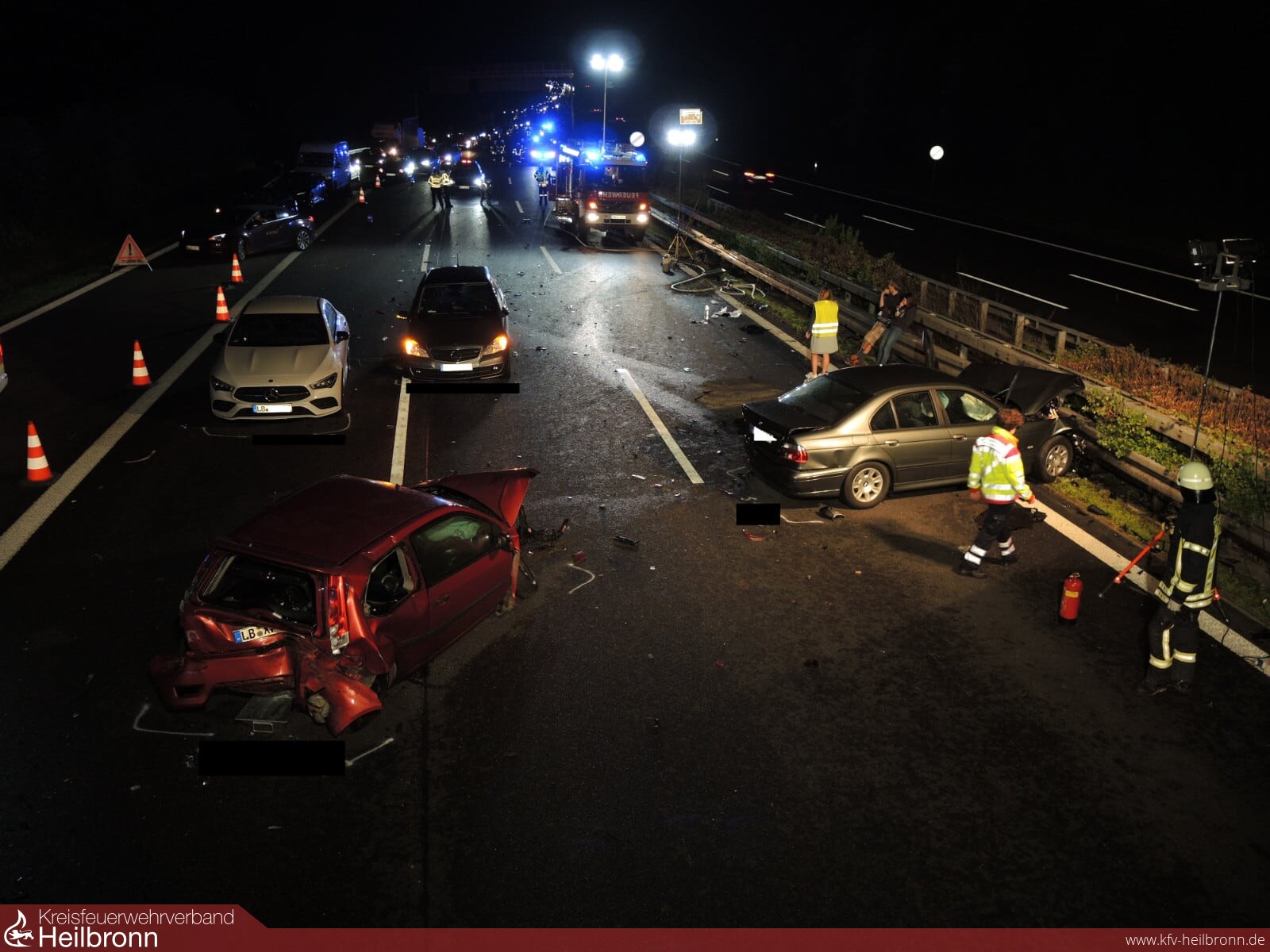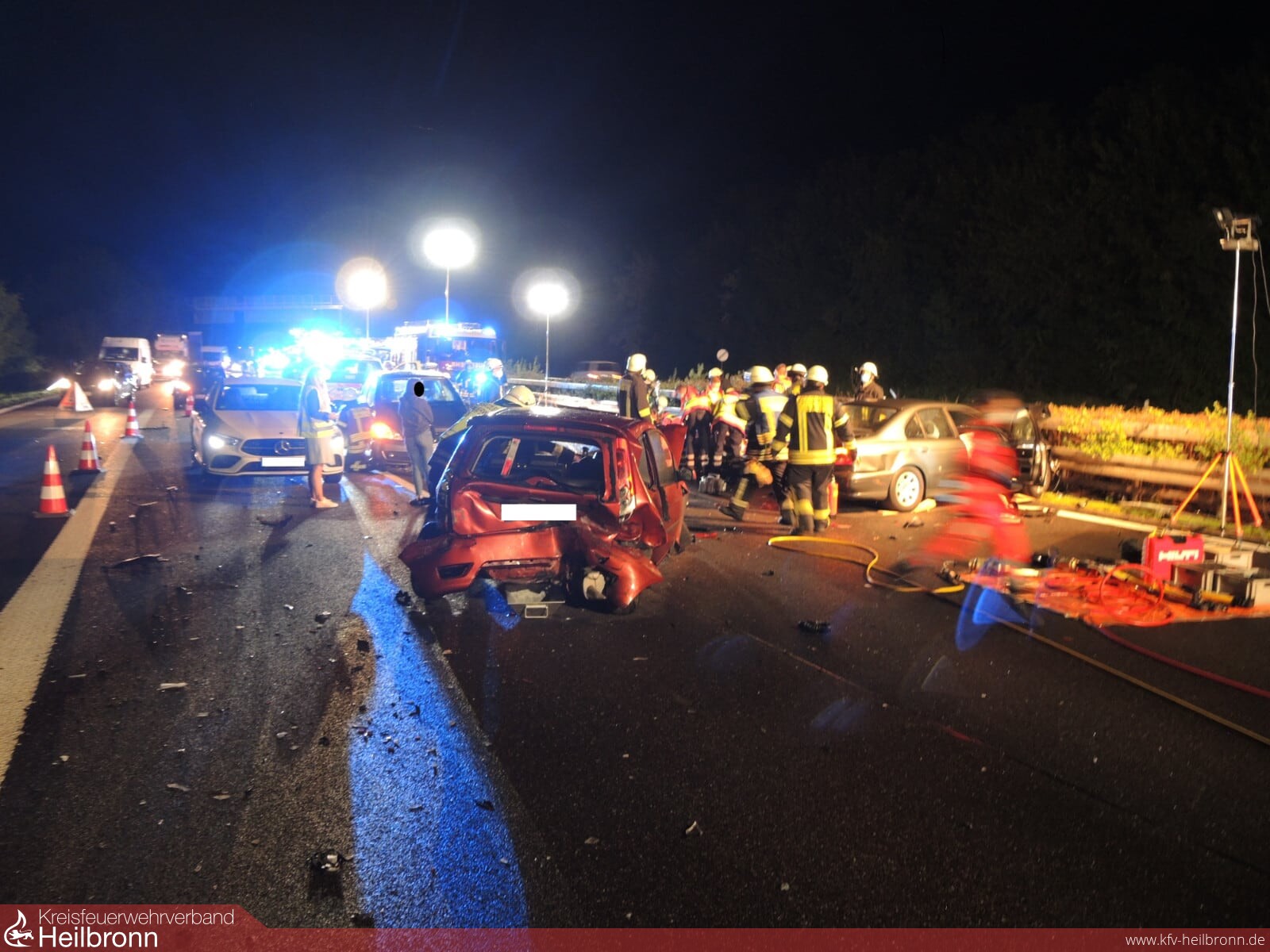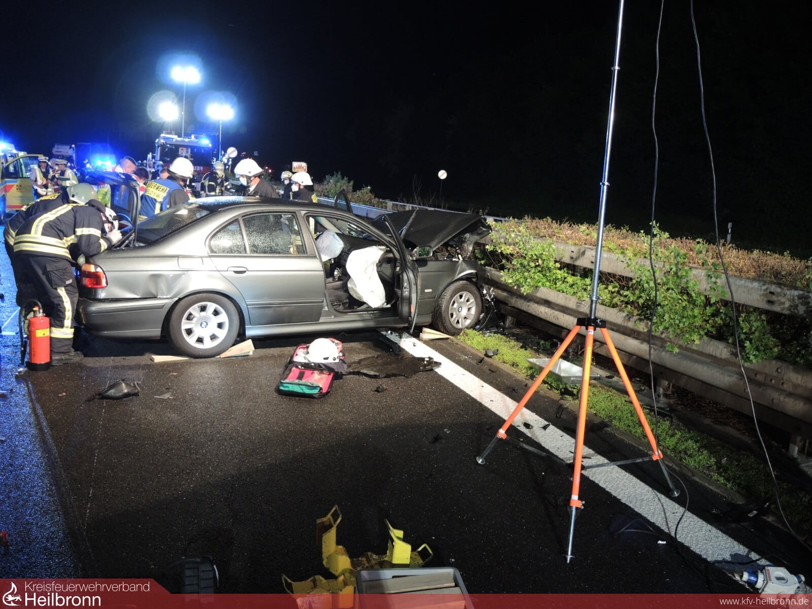 Die Feuerwehr Ilsfeld musste die Unfallstelle für die Unfallaufnahme und Dokumentierung durch einen Gutachter mit mehreren Lichtmasten ausleuchten.