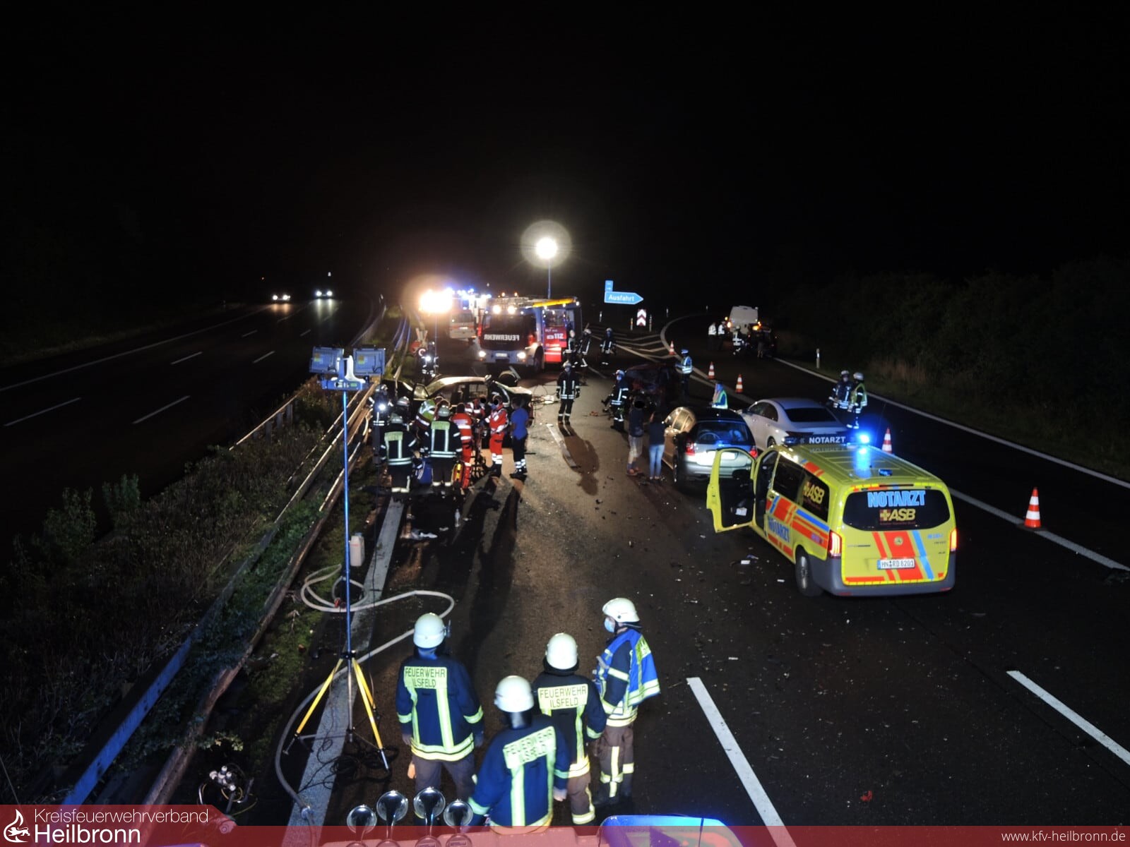 Um 22.19 Uhr wurde die Feuerwehr Ilsfeld zu einem Verkehrsunfall mit mehreren Fahrzeugen und einer eingeklemmten Person auf die A81 alarmiert. Nach ersten Angaben durch die Leitstelle hieß es der Unfall sei vor der Abfahrt Mundelsheim. Während der Kommandowagen und das HLF20 schon in Richtung Mundelsheim auf der Autobahn waren erfolgten weitere Anrufe bei der Leitstelle, mit der Angabe, dass sich die Unfallstelle vor der Abfahrt Ilsfeld von Untergruppenbach kommend befindet. Deshalb fuhr das LF20 und das LF10 von Schozach auf die A81 in Fahrtrichtung Untergruppenbach auf. Hierdurch konnte bestätigt werden, dass sich die Unfallstelle kurz vor der Abfahrt Ilsfeld in Fahrtrichtung Stuttgart befand.