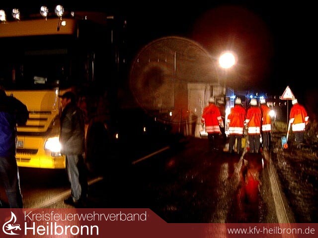 Die Abteilungen aus Möckmühl und Züttlingen verschlossen die Leckage, nahmen die bereits ausgetretene Flüssigkeit auf und streuten die Fahrbahn mit Ölbinder ab.